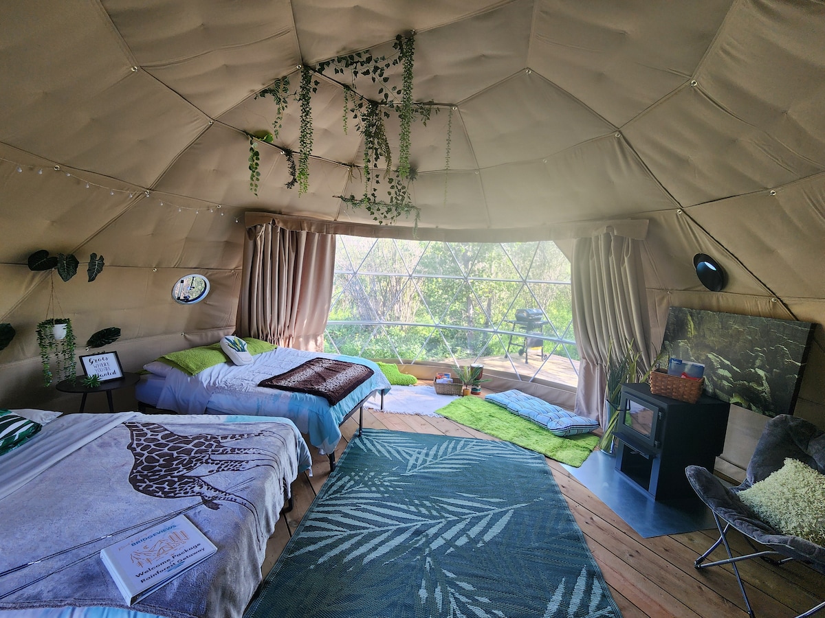 ¿Listo para escapar de las Badlands canadienses? Vamos a entrar en tu propia escapada a la selva tropical. Disfruta de 2 camas dobles, mucha vegetación y relájate en tu propio oasis tropical. Aunque los Badlands son conocidos por el clima cálido y seco durante los meses de verano, queremos que disfrutes de la capacidad de tener un entorno verde y exuberante dentro de tu geodoma después de un largo día de aventura al aire libre. Bridgeviews se esfuerza por garantizar que nuestra ubicación tenga un poco de todo para todos.
