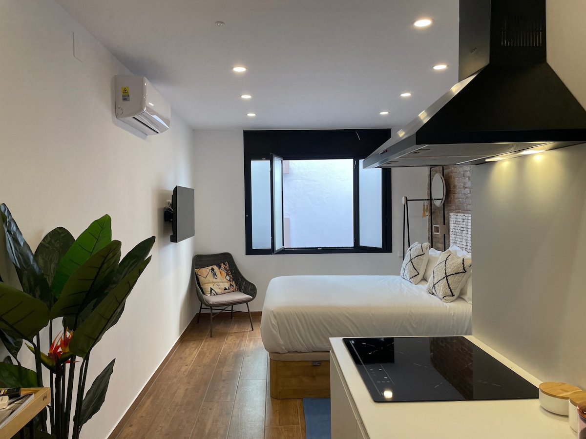 Apartamentos delicadamente restaurados con capacidad para 2 personas máximo, equipados con una cama queen size (1.60 m. x 2.00 m.) y un sofá. Amplios ventanales que permiten la entrada de luz natural en un entorno urbano tranquilo. Tienen un salón-comedor y dormitorio, cocina independiente totalmente equipada y baño completo con plato de ducha. Las tonalidades del interior transmiten frescura, tranquilidad, confianza, bienestar, energía positiva, estimulan la creatividad y la lectura.