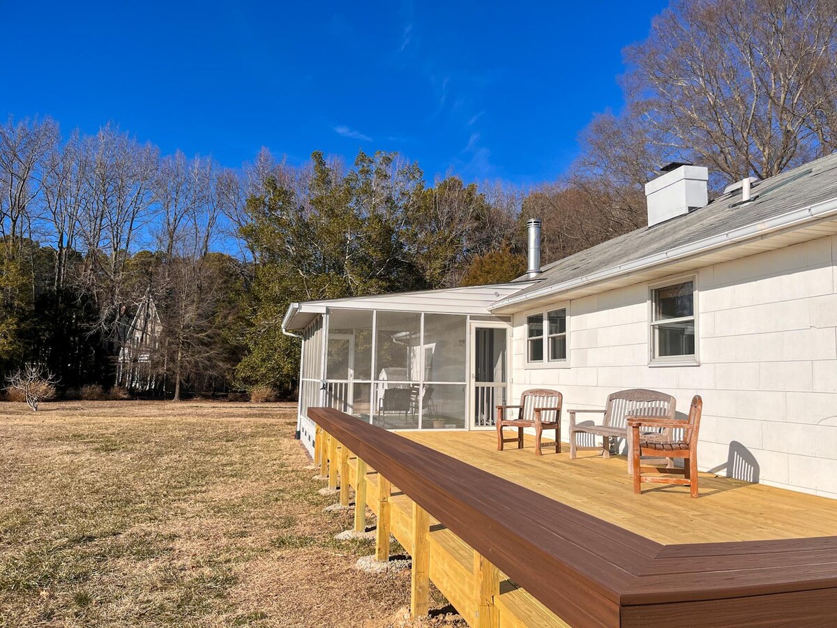 Casa frente al agua de 3 dormitorios/2 baños en 3 acres con cocina remodelada y chimenea central de ladrillo. El dormitorio principal tiene una cama tamaño king con vistas al agua; el dormitorio 2 tiene una cama tamaño queen + cuna; el dormitorio 3 tiene 2 camas individuales (se pueden combinar en una cama tamaño king). Los múltiples espacios al aire libre incluyen una amplia terraza para observar las estrellas, un porche con mosquitero y columpio de banco, y amplias vistas a la pradera. Disfruta de épicas puestas de sol al otro lado del río, explora los senderos cercanos o relájate cerca de los muelles públicos. Casa completa + garaje incluido para mayor privacidad y comodidad.