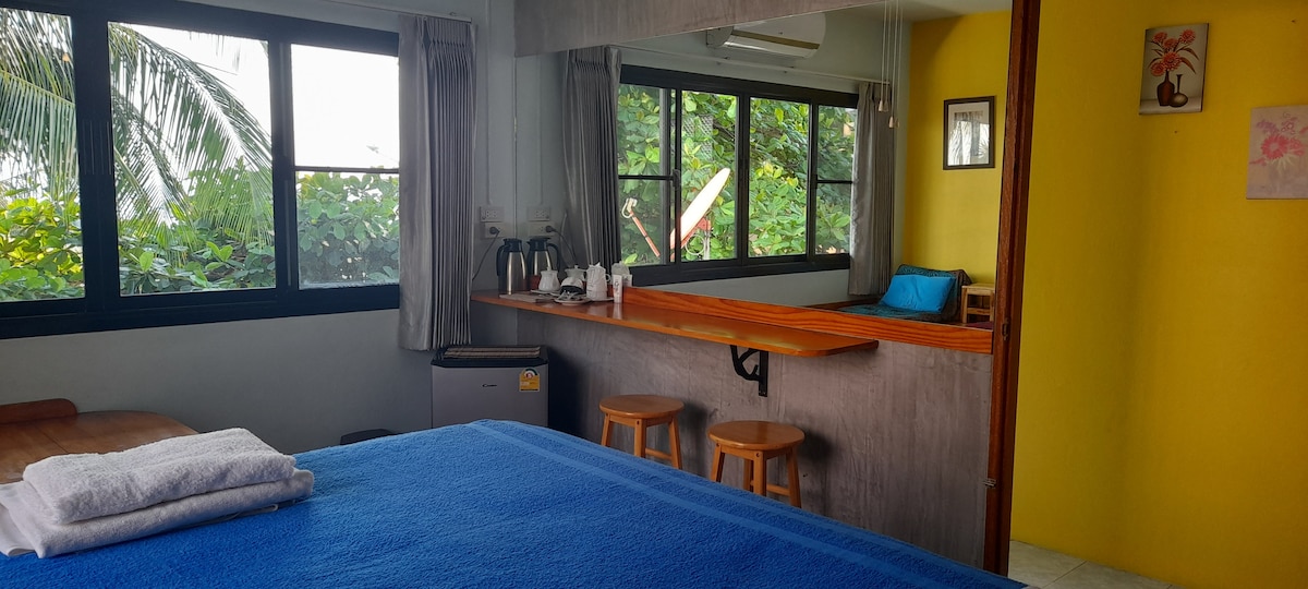 Este lugar único tiene un estilo propio. ¡Situado a pocos minutos caminando del muelle de Kohphangan y de todas las tiendas, bares, en la histórica calle Old Town Street en Thong Sala , frente a la playa y en una ubicación tranquila al mismo tiempo! Dormirás en una cama tamaño king con aire acondicionado y ventilador,ducha con agua caliente y nevera ,cafetera/tetera, wifi gratuito. Disfruta del desayuno/brunch en nuestro jardín secreto y explora nuestra hermosa isla ¡Estaremos en cada paso contigo en este viaje!