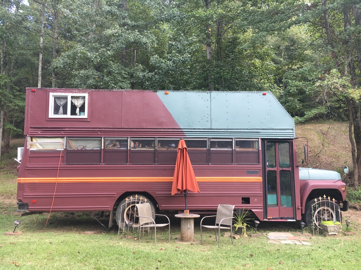 Este autobús escolar Bluebird de 1970 se ha convertido en un espacio habitable cómodo y caprichoso. La parte trasera se conecta a una nueva adición con un baño, sala de estar y loft para dormir para un adulto o dos niños. Está en un acre vallado en la región montañosa y tiene su propia entrada privada. El patio tiene sillas agradables y acogedoras y una parrilla de propano o carbón a tu elección. El autobús tiene una nueva cama tamaño queen y cocina americana con una nueva cocina de gas y una barra de desayuno de granito, café y té incluidos. Ahora con wifi.