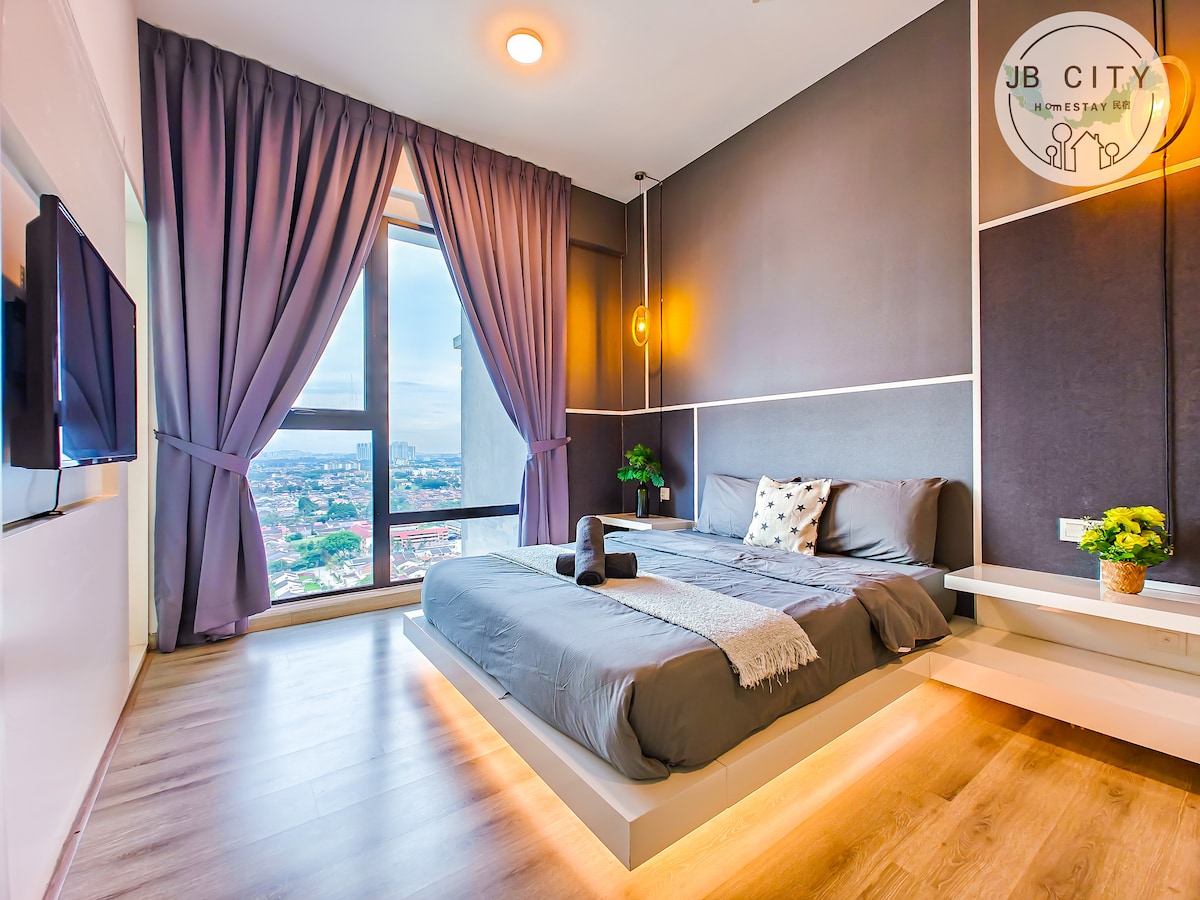 ¡Diseño de lujo y espaciosa unidad de 3 dormitorios con bañera! Camas tamaño king y Queen de primera calidad que garantizan tu buen sueño aquí con una vista increíble de Midvalley Mall y la ciudad de JB. ¡Tenemos TV inteligente equipada con aplicaciones de YouTube y Netflix! ¡También la máquina purificadora de agua que facilita tu estancia aquí! Rodeado de centro comercial y una gran variedad de sabrosas comidas locales. - A 2 minutos en coche de Midvalley Southkey JB - A 5 minutos del centro comercial KSL City Mall. - A 8 minutos del centro comercial City Square y Custom JB.