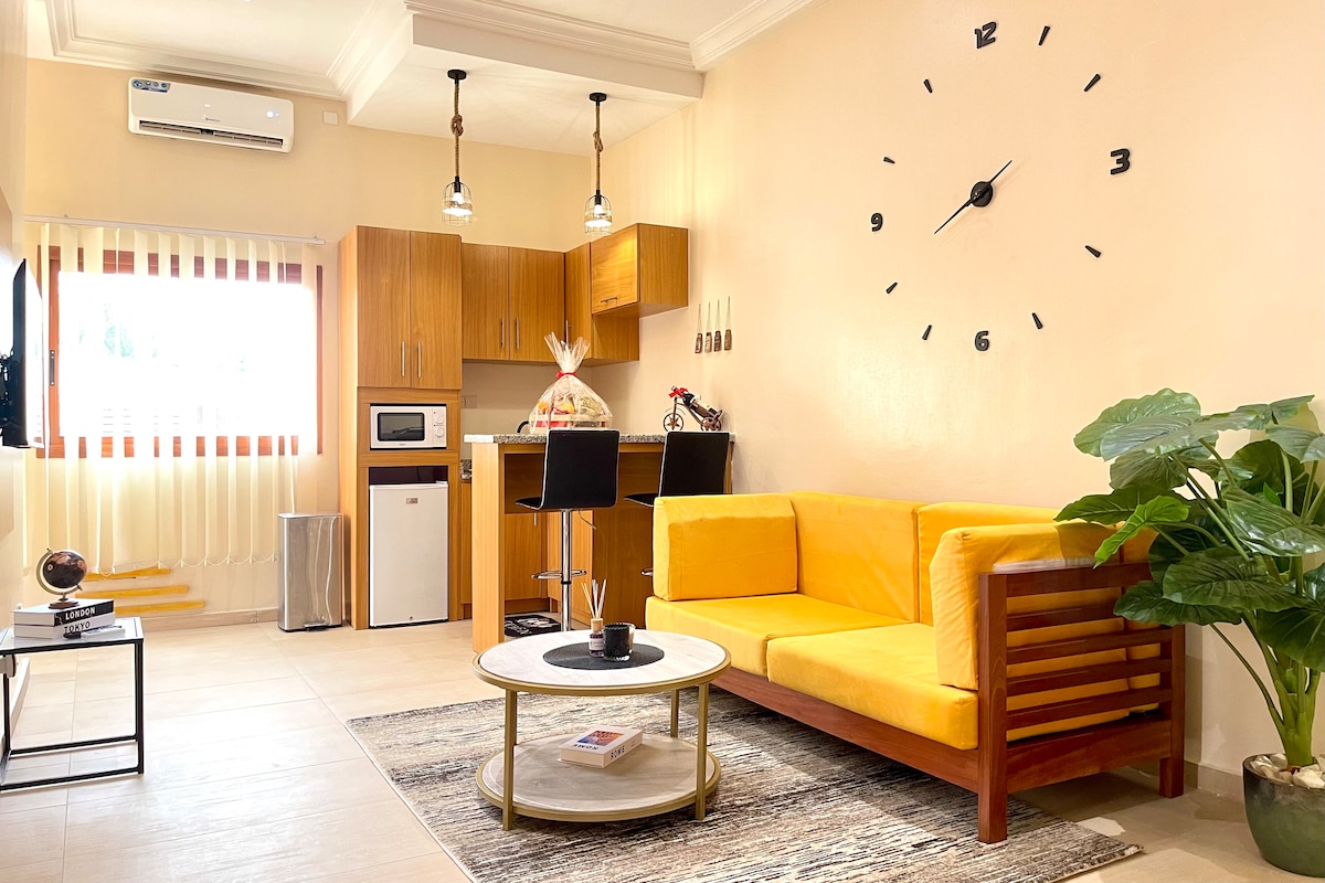 Completamente renovado, nuestro luminoso alojamiento combina la elegancia africana y occidental. Situado en el corazón de Akwa, ofrece un acceso rápido a los mejores lugares de la ciudad. Disfruta de una cocina americana moderna, wifi Starlink (120 Mb/s), un escritorio dedicado, insonorización única con altavoces integrados, IPTV, aire acondicionado y un generador. Seguridad 24/7 con cámaras y caja fuerte, limpieza 5★ garantía.