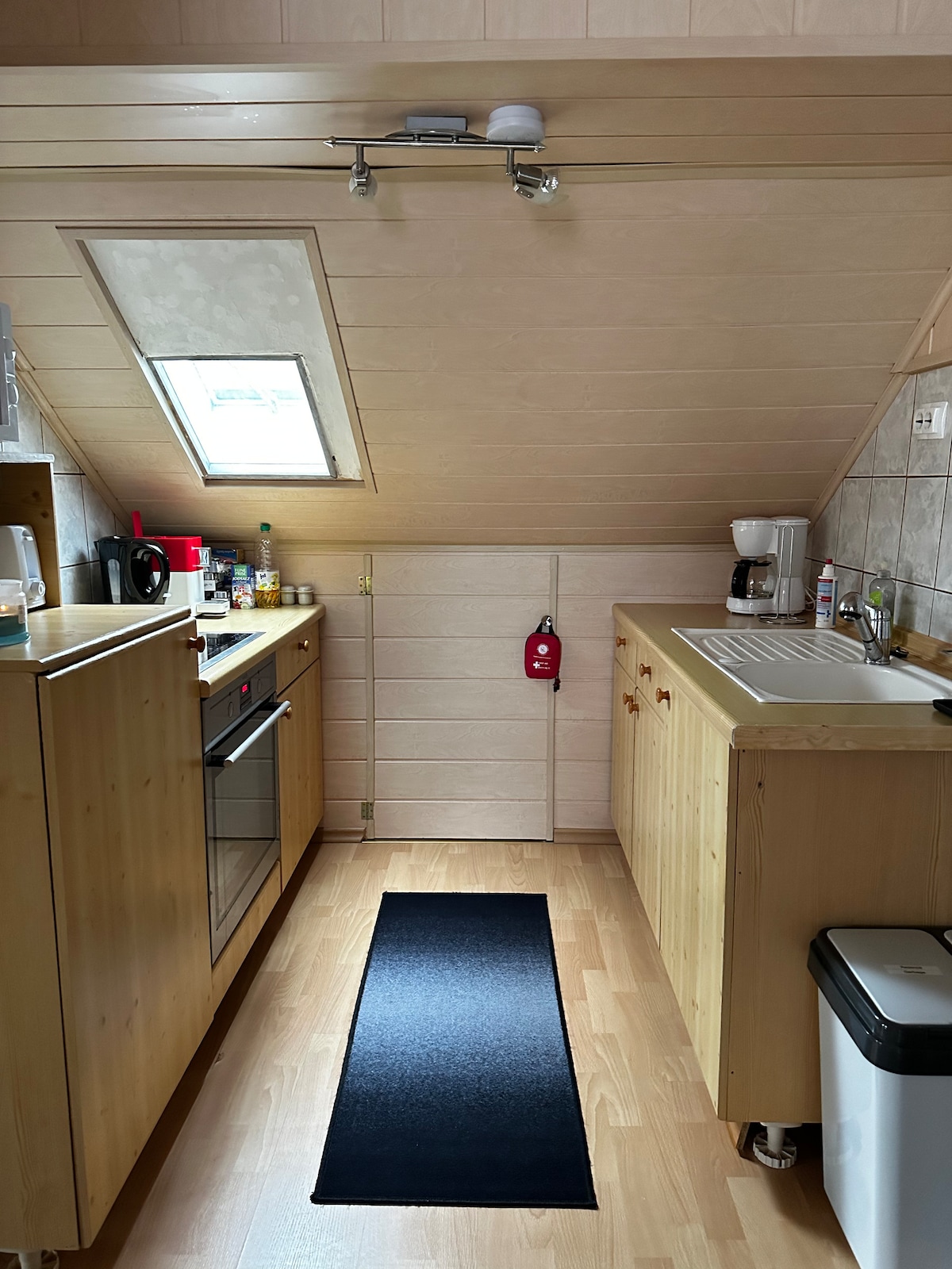 Kleine, offen gestaltete Ferienwohnung/ Einliegerwohnung im Erdgeschoß mit Einbauküche (Kaffeemaschine, Toaster, Wasserkocher, Kühlschrank mit Gefrierfach), Bad (Shampoo, Duschgel etc.) mit Dusche und WC, Handtücher, Bettwäsche, Föhn. Schlafzimmer mit Kleiderschrank, Wohnzimmer mit Schlafsofa, Esstisch, TV. Sagt uns gerne Bescheid wenn wir die Schlafcouch beziehen sollen. Familie mit Kinder sind herzlich willkommen, es ist ein Hochstuhl vorhanden sowie verschiedene Spielsachen.