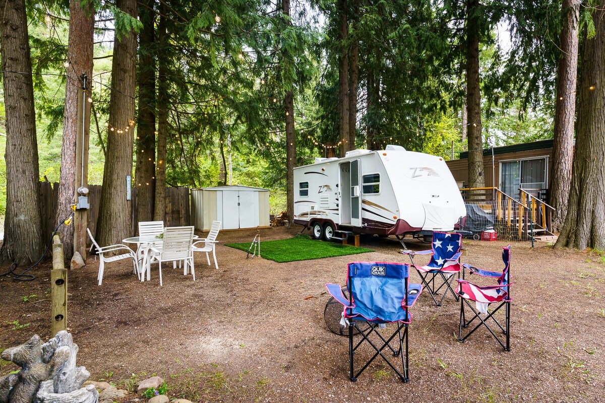 ¡Relájate cerca de la naturaleza mientras estás a pocos minutos de las emociones del Silverwood Theme Park! Nuestra acogedora caravana de 26 pies de 2021 está enclavada en el tranquilo bosque y ofrece un refugio relajante después de un día de aventura. Ubicada junto a una carretera pavimentada para facilitar el acceso, esta encantadora caravana está en nuestra propiedad, cerca de la carretera principal y la casa. Disfruta de la configuración al aire libre bajo el Awening, que incluye sillas, fogata y cocina. El césped proporciona un lugar cómodo para relajarse. Esta es una propiedad 100% para no fumadores.