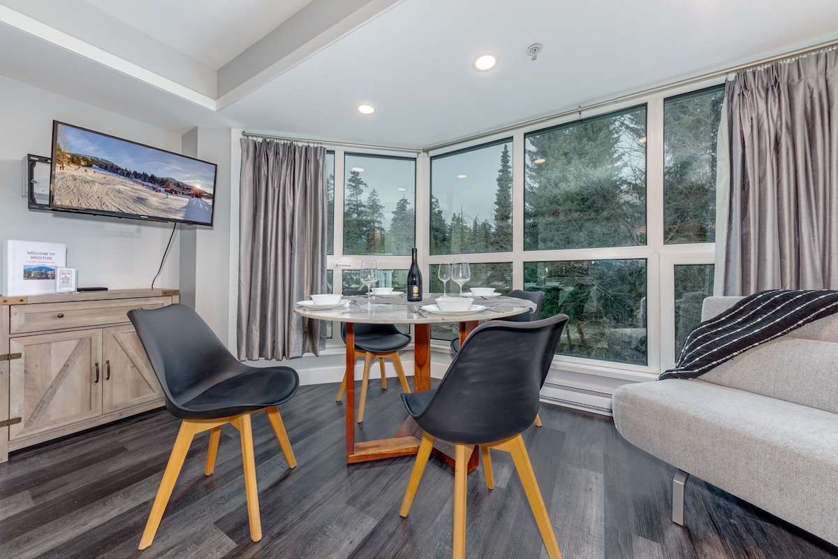 Welcome to your mountain oasis. A 1 min walk from the Blackcomb lift! Our modern condo is a bright, spacious 1 bedroom with wrap around windows for perfect tree-lined and mountain views. Look right up Whistler mountain while sipping coffee from your kitchen table! The suite has it all: - king bed - sofa bed - full kitchen - soaker jet tub - Keurig - Bose speaker - central A/C - upgraded July 2025 The building has a gym, laundry, pool and outdoor hot tub.