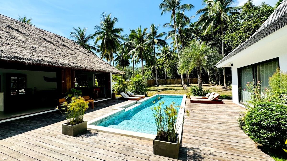 ¡Duplica el tamaño de tu villa promedio! Techos altos, planta abierta, enorme piscina de agua salada y enormes espacios de estar interiores/exteriores, 3 camas tamaño king y un sofá cama. Ubicación céntrica en una carretera de hormigón plana y segura con acceso rápido y fácil a todas las partes de la isla. Edificio completamente nuevo con cocina y muebles de calidad europeos, incluido agua potable filtrada. 2 salas de estar con televisores grandes y entradas separadas. Seguridad total y privacidad con una valla de bambú de 3 metros rodeada de cocoteros y jardín tropical.