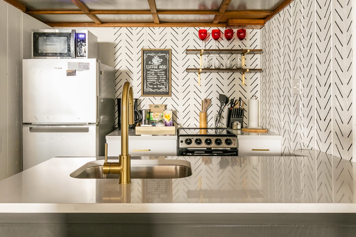 Un estudio privado recién construido, ubicado en un patio detrás de una histórica casa victoriana construida en 1898. Regístrese en su propia entrada con caja de seguridad con llave con cama Queen Murphy y armario pequeño Sala de estar con sofá y mesas Cocina totalmente equipada con nevera, estufa eléctrica, microondas y comedor Ducha a ras de suelo Balcón con bistró con vistas al patio Muelle de carga USB TV de 40 pulgadas que gira 180 grados para ver en la cama Roku con aplicaciones premium WiFi