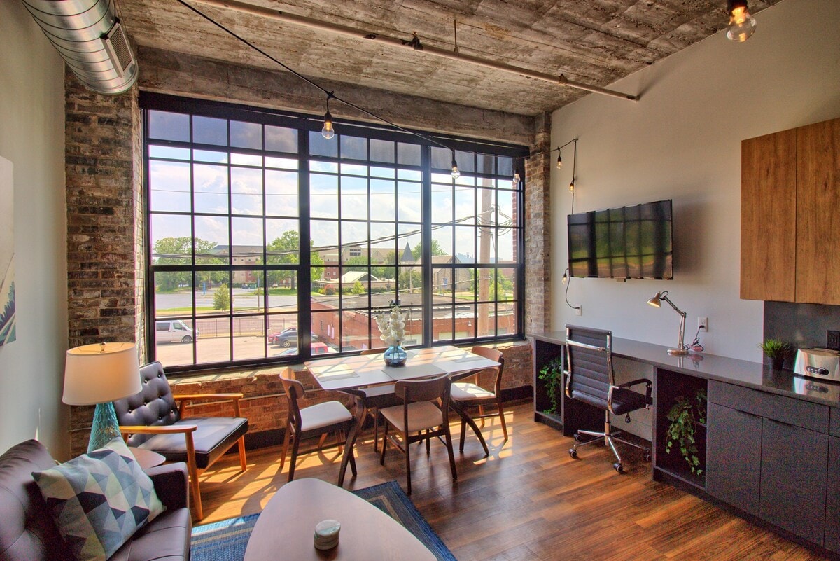 The Nash Loft is a stunning corner loft with two spacious bedrooms, two designer bathrooms with black stainless fixtures and frameless glass showers, 12’ ceilings, a comfortable workspace with high-speed internet connection, stackable washer + dryer, an Edison-illuminated community courtyard, and a fully-equipped kitchen with black stainless appliances. Situated along the famous Locust Street in the heart of Midtown, you’ll be steps from SLU, Wells Fargo, BJC, and the Grove.