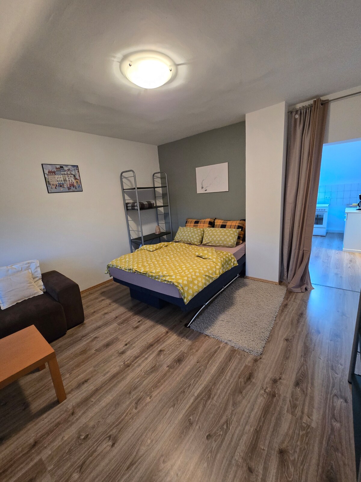 Whether you are traveling for business, tourism, or personal reasons: The apartment is perfect for you if you are looking for a cozy and modern temporary home. Especially ideal is the workspace with a height-adjustable desk. With 250 Mbit/s, you can surf and stream without any problems. Free parking is available at the house. The apartment has a double bed, a sofa bed, a fully equipped kitchen, and a balcony with a view of the greenery, Netflix, and a fitness area.