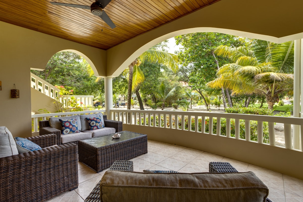 Welcome to Los Porticos 3B, a luxurious ground-floor villa on the breathtaking Placencia Peninsula. Perfect for families or small groups, this spacious two-bedroom villa offers two queen beds, a cozy living area with a sofa bed, and a fully equipped kitchen with modern appliances.