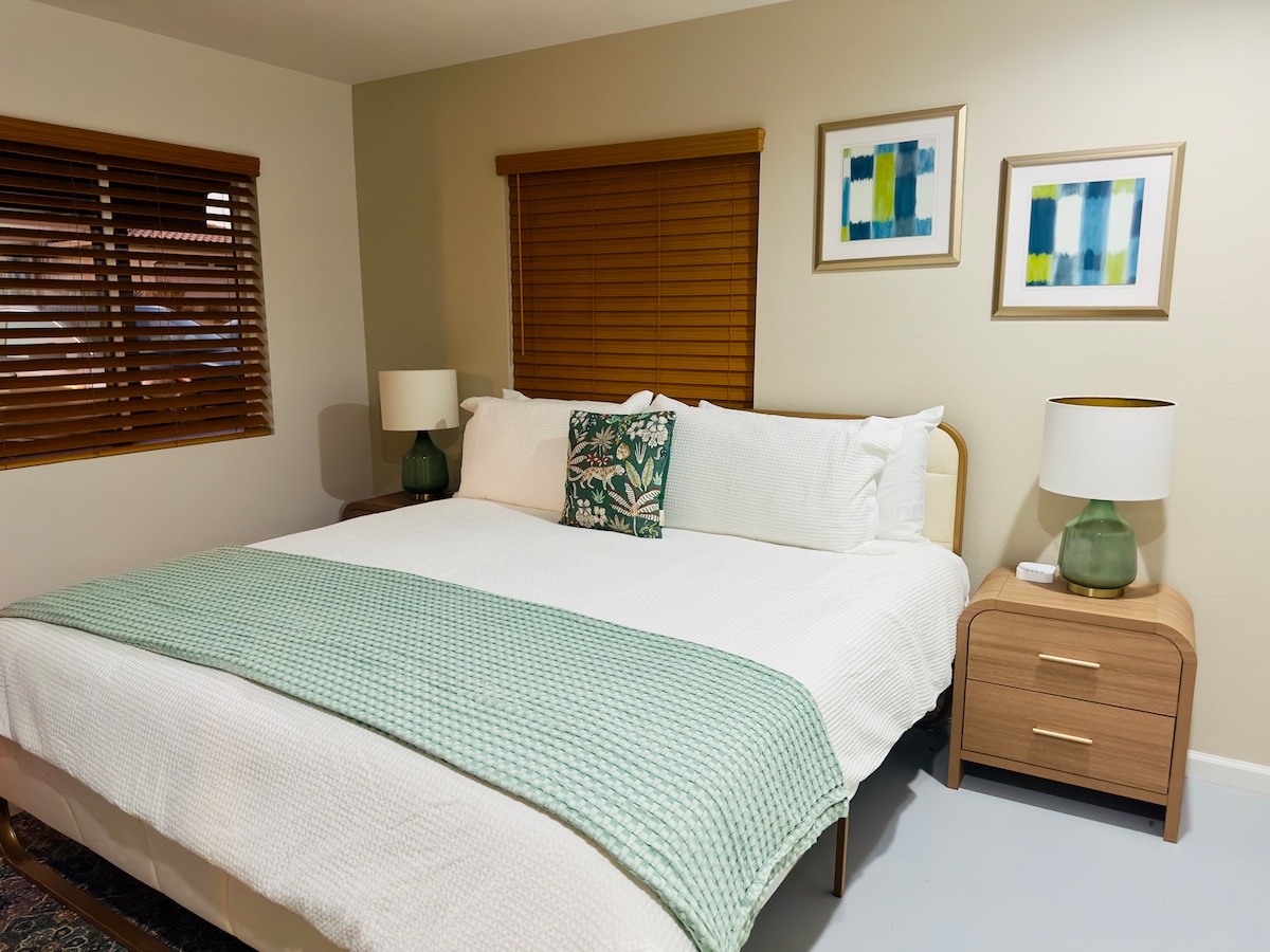 Inspired by Wabi-Sabi philosophy of finding beauty in imperfection, we created a stylish space with a hint of Japandi style. Come relax in this beautiful space. Unit offers a King bed, private bath & full size kitchen. Coming Soon: *Pool is under construction. We expect pool to be ready March 2026. Currently, backyard access is restricted during construction. *Central AC is being installed soon. As of now we have no ac/heat but weather is pleasant and we do provide a fan and space heater.