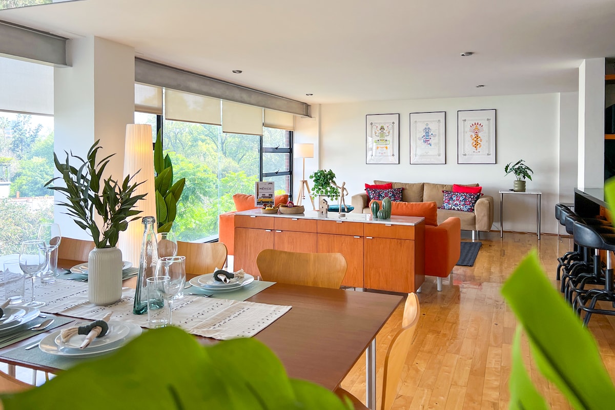 Jardín de tradiciones, ubicado en un edificio porfiriano en Roma N, decorado con referencias a tradiciones méxicanas. Cuenta con: baño espacioso y equipado; lavadora estratégicamente ubicada; cocina equipada con parrilla, microondas, y refrigerador; comedor con mesa y sillas para cuatro personas; Sala de estar con sofá y sillas para relajarse. Habitación principal con cama king-size, ropero, TV y aire acondicionado. Acceso al jardín desde la sala y la recámara. Ideal para estancias prolongadas.