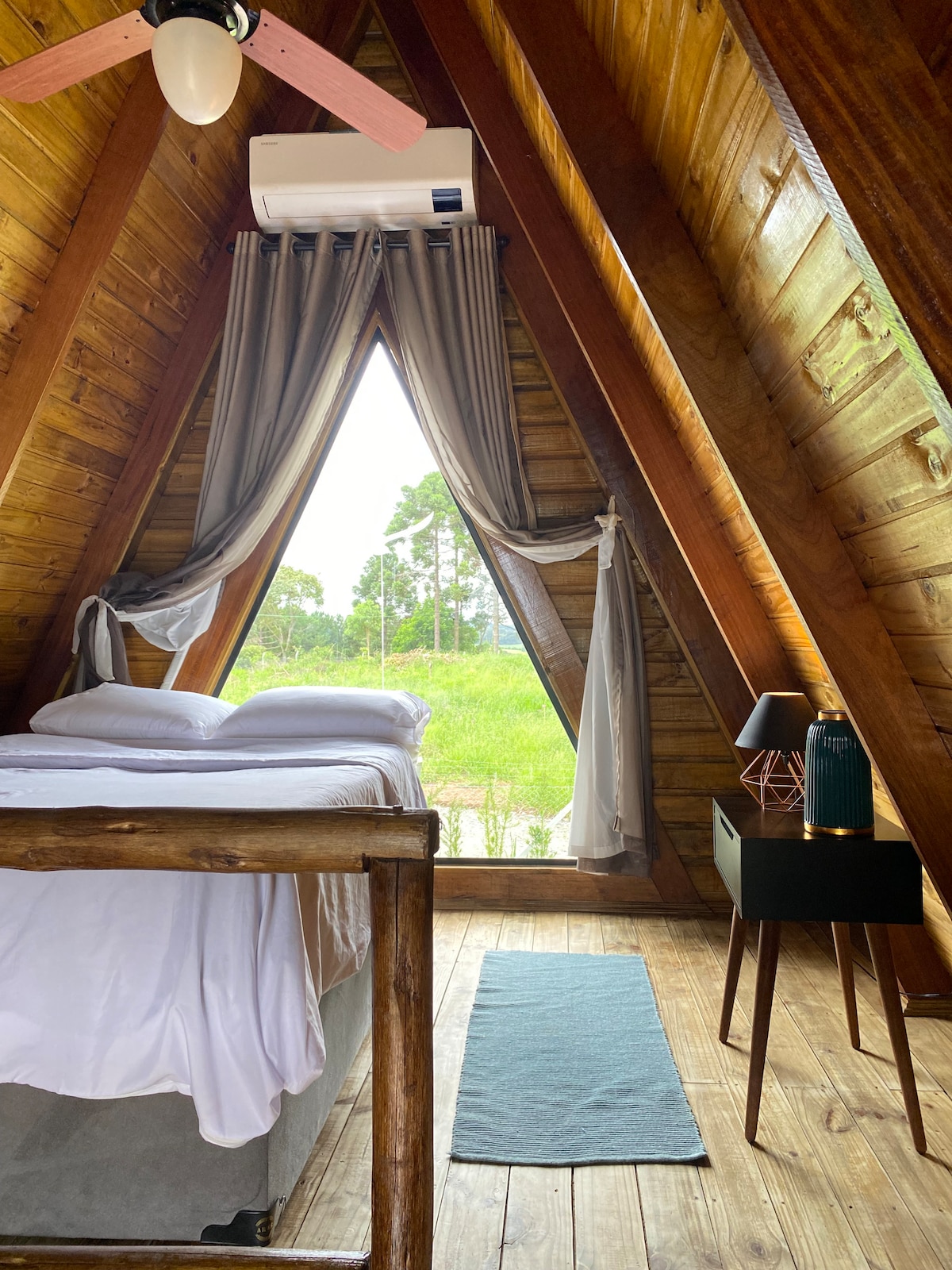 Hecha por nosotros, está integrada con la naturaleza y tiene una vista increíble, ideal para ver la salida de la luna y la puesta de sol, estar en la bañera, en el sofá o debajo de un árbol, tiene una cama doble y un sofá cama, minibar, cocina, ducha y bañera de inmersión a gas, tiene barbacoa y lugar para fogata al lado. Desde el estacionamiento hasta la cabaña hay una subida de 50 metros, tiene una escalera Santos Dumont inclinada para acceder al segundo piso. Tenemos un mercado exclusivo para los huéspedes.