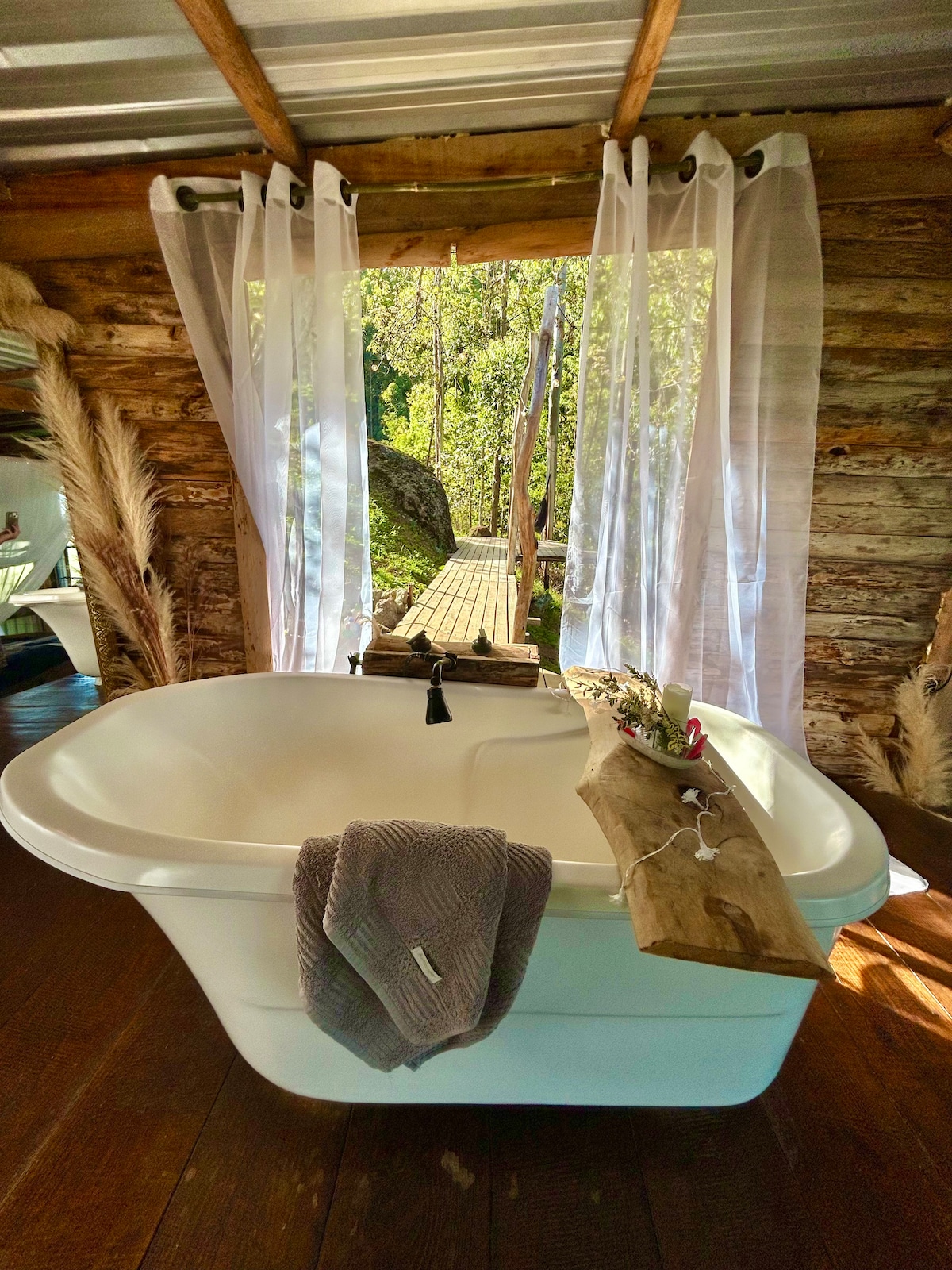 Esta casa completamente nueva se encuentra elevada sobre los árboles dentro de la ecoaldea Aldeia Rizoma, una propiedad cerrada a 15 minutos del centro histórico de la ciudad. La propiedad ofrece un gimnasio al aire libre, sauna (con cargo adicional), senderos privados y acceso a 5 cascadas privadas. El estudio de un dormitorio tiene una cama king size, ofrece un jacuzzi privado y una cocina completamente equipada. Hay una cama adicional que se puede usar para una tercera persona.