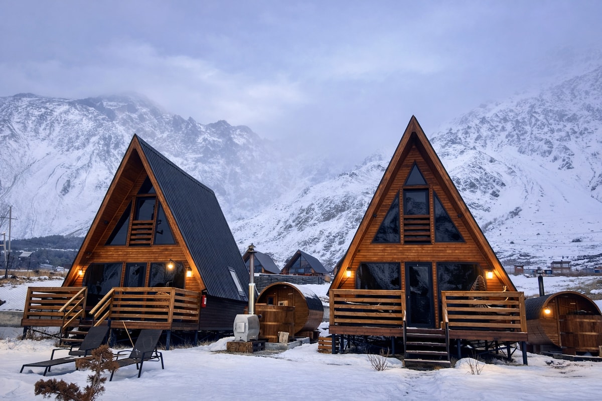 Planifica tu consejo en Kazbegi Twins. Las casas rurales de madera en Stepantsminda garantizarán un espacio ecológico, seguro y vistas espectaculares de las montañas Mkinvari y Kuro. Las casas rurales están equipadas con dormitorio privado y baño, televisión y WIFI gratuito.