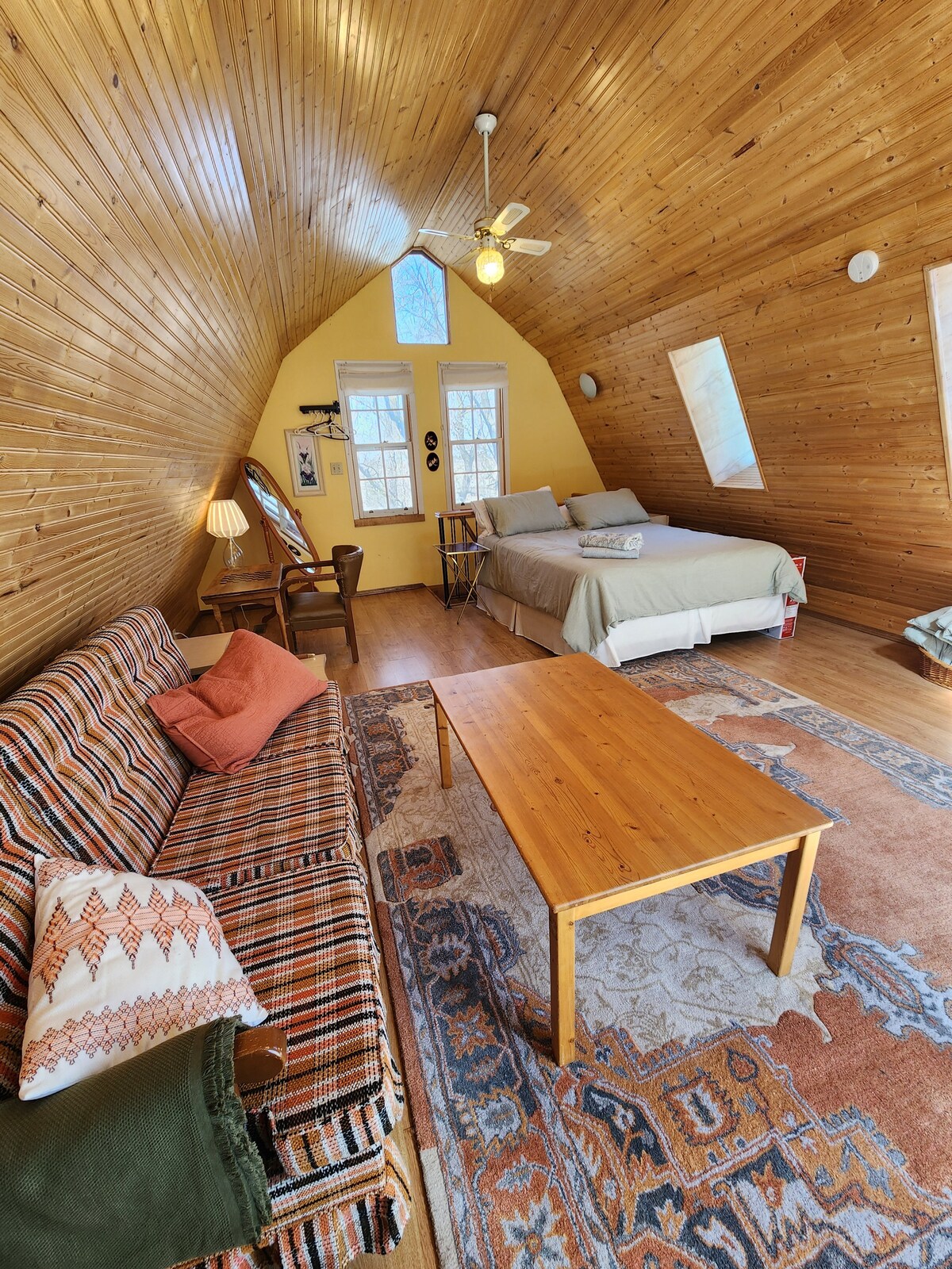 Escape the busy city, and take some time to relax, reflect and recharge at this unique and peaceful cabin located on a working farm. Enjoy the tranquility of farm life as you work on your art, relax on the deck or watch a movie on a rainy day. The Fairfolk Studio is located on the edge of Beaver Hills Dark Sky Preserve, so if you're into stargazing, bring along your telescope and set it up on the deck. The Fairfolk Studio is suitable for singles, couples or families with older children.
