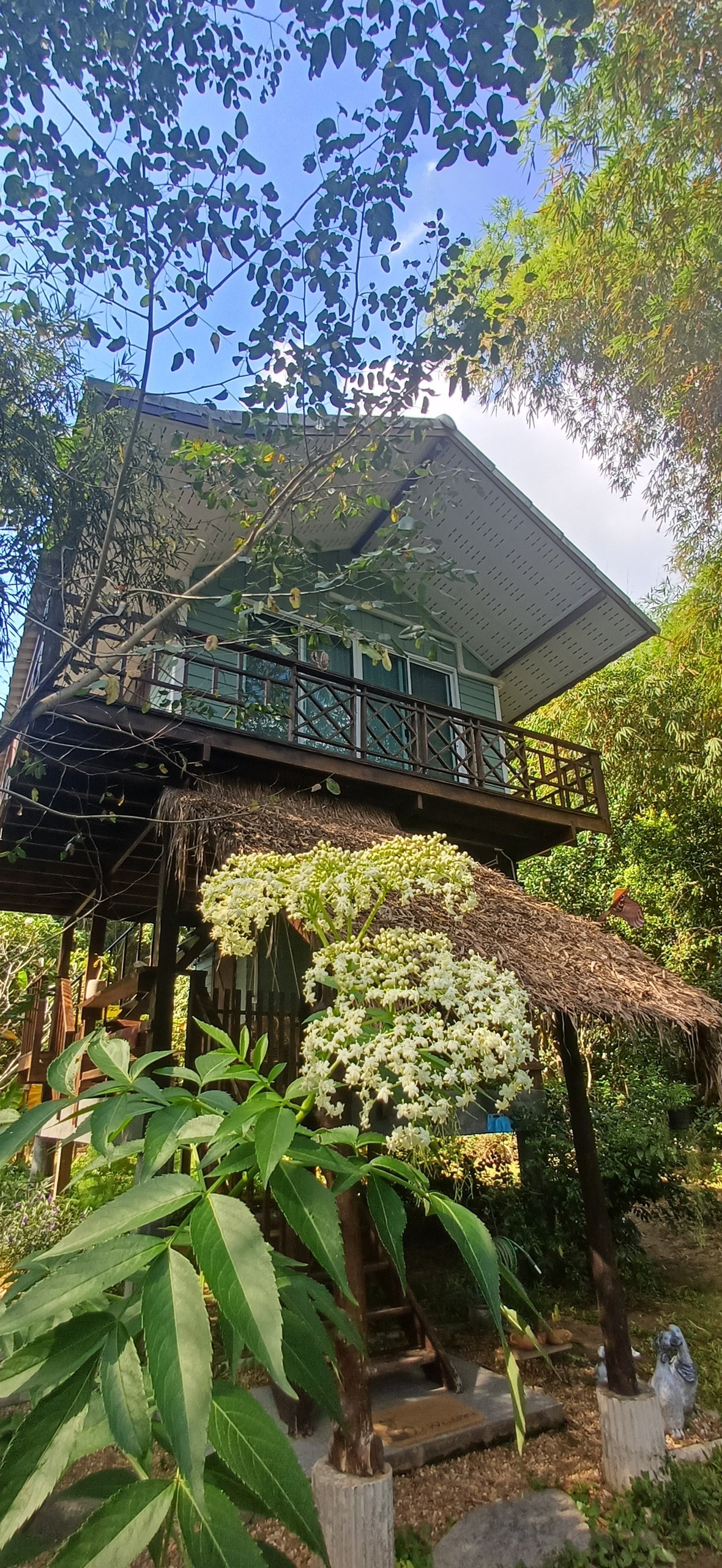 La casa de 2 pisos en el jardín es tranquila y privada, junto a la orilla del agua, en medio de un entorno natural y una variedad de árboles.