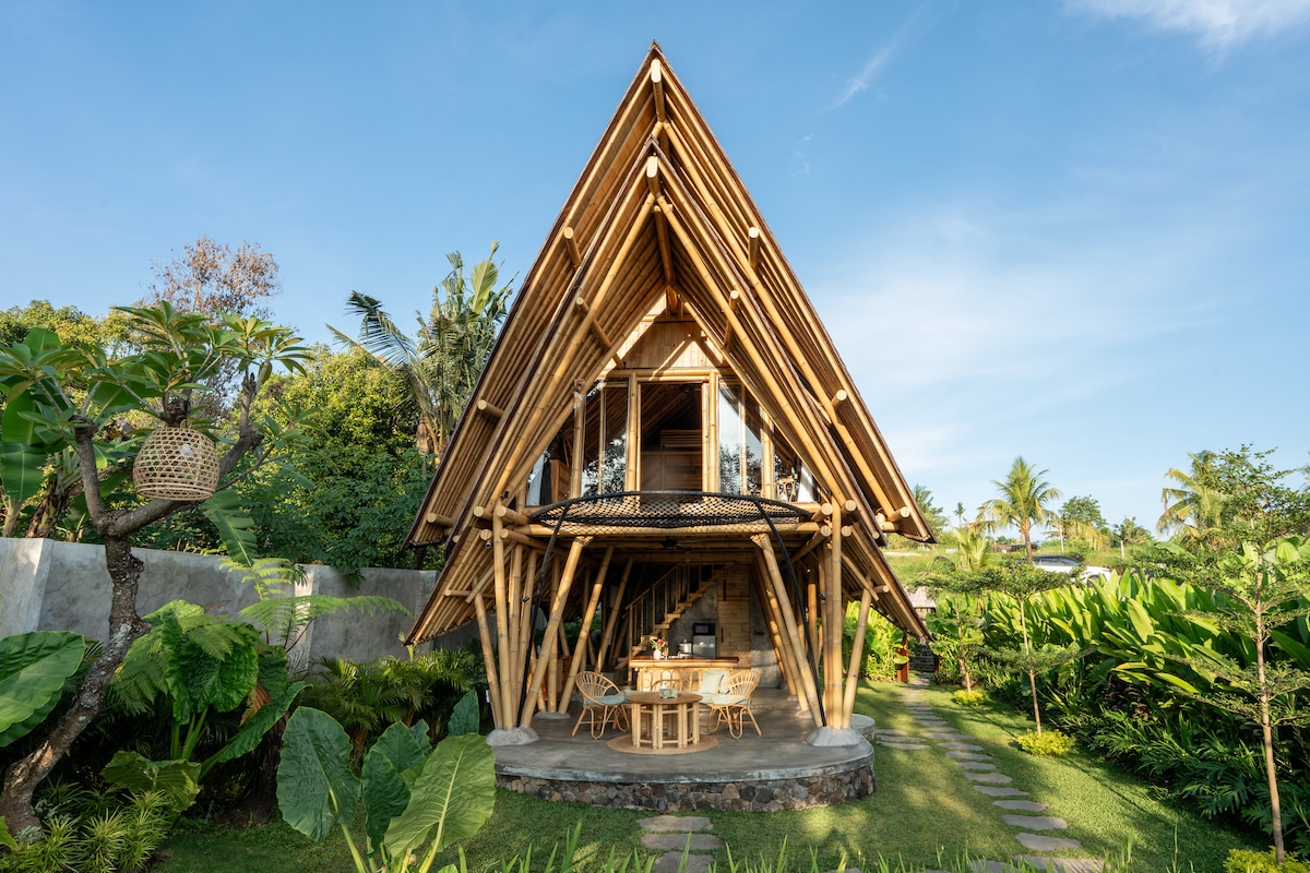 Stay and experience the unique and exclusive design of our bamboo villa, offering stunning sunrise and hill views in the heart of Sambangan Eco Village. This one bedroom villa features an exclusive design crafted entirely from sustainable bamboo, with an ironwood roof and beautiful teak wood flooring. It's a unique place for honeymooners, peace seekers, writers, or anyone looking for relaxation and tranquility.