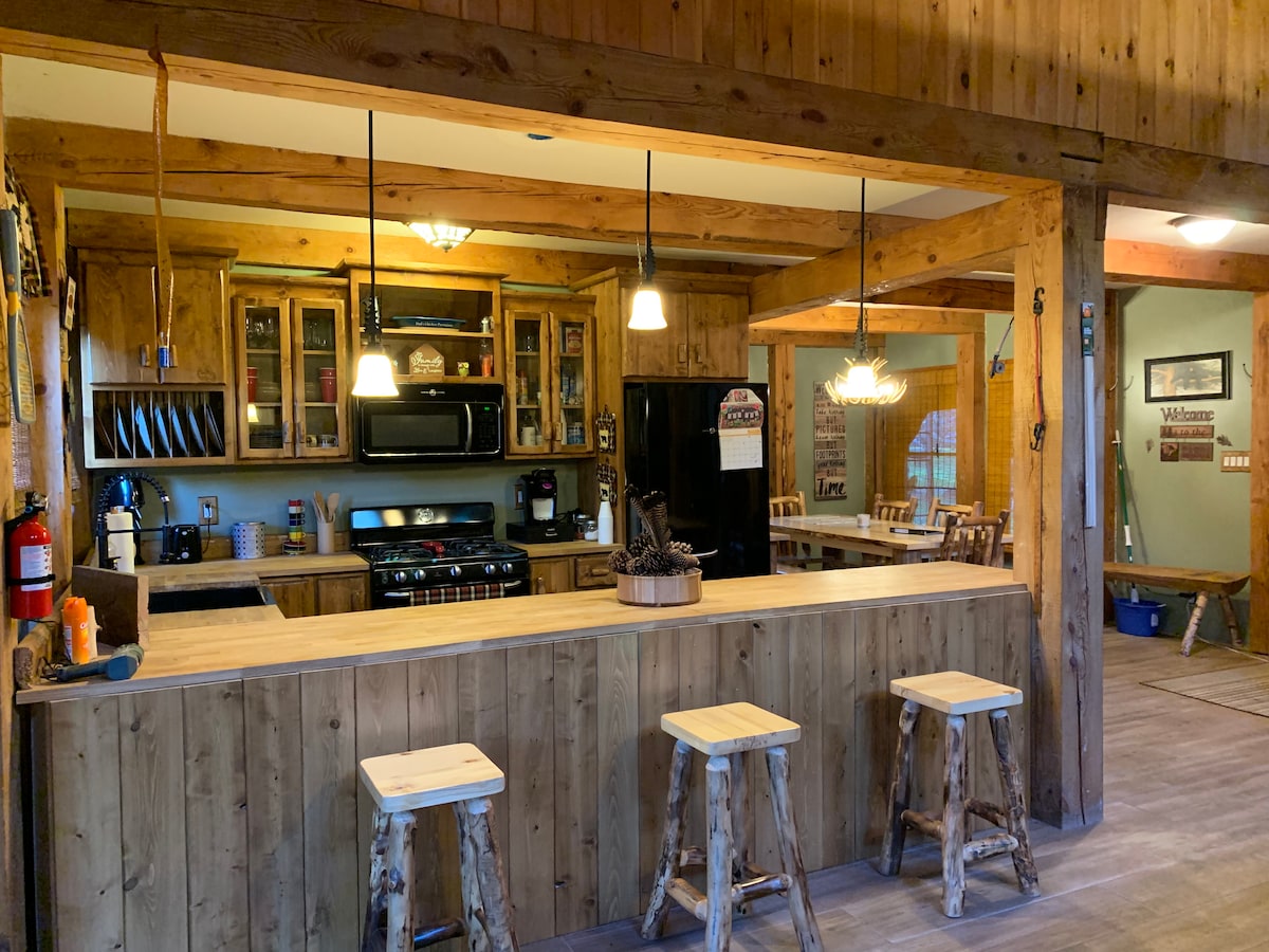 Cabaña Barn de 2 pisos Post & Beam de 1200 pies cuadrados ubicada en más de 18 acres de la propiedad con 1250 pies de fachada que conduce a esta joya. Muebles de madera Amish y una estufa de leña. El concepto de loft abierto en el segundo piso ofrece 1 cama tamaño king, una cama nido con 2 camas individuales (capacidad para 4 personas), 1/2 baño y espacio en el armario. La planta baja ofrece cocina, comedor, sala de estar y baño completo. Parque privado en la propiedad con hamaca, cancha de voleibol y baloncesto, columpio, tobogán y casa de juegos, juegos de patio (en la casa y cobertizo) barbacoa y fogata.