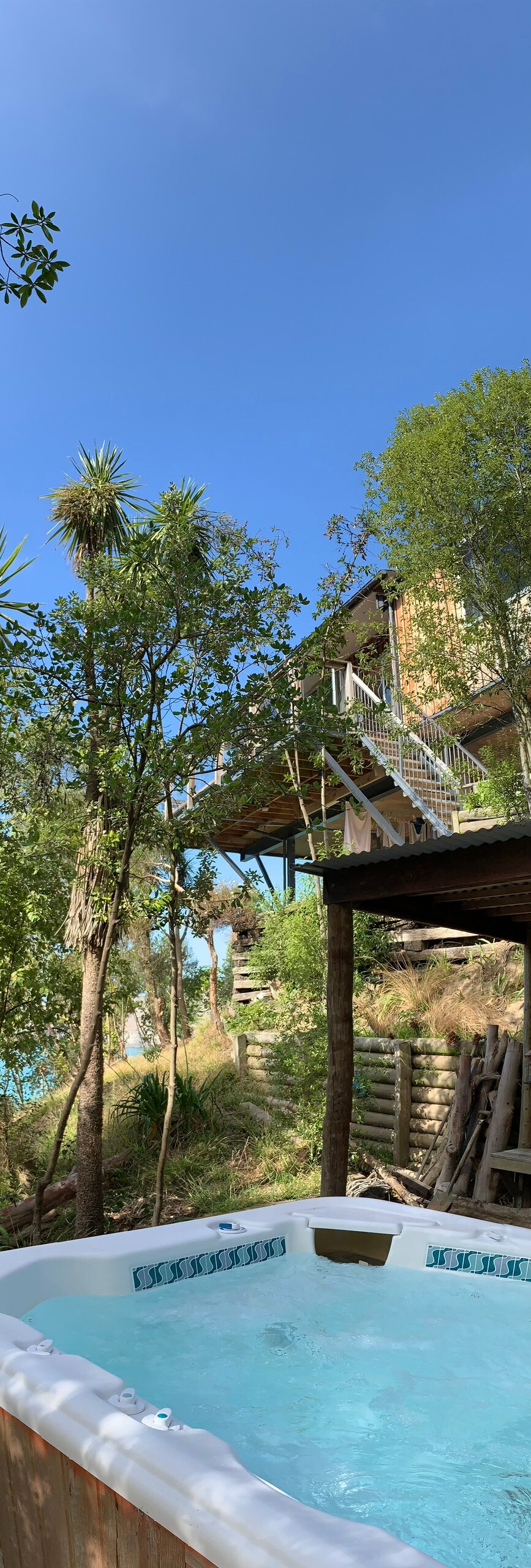 Relájate y desconecta en este alojamiento tranquilo y elegante al final de un callejón privado. A la que se accede por escalones externos, la casa está dividida en dos cápsulas conectadas por una cubierta externa. Los techos altos y las paredes de madera crean un cálido interior con grandes ventiladores de techo en cada habitación y una chimenea de leña. Las puertas correderas de cristal se abren a vistas espectaculares del puerto y las colinas. Disfruta de una bebida o barbacoa en la gran terraza o relájate con un baño caliente al aire libre. A solo 5 minutos a pie del supermercado local y del bar de cervezas.