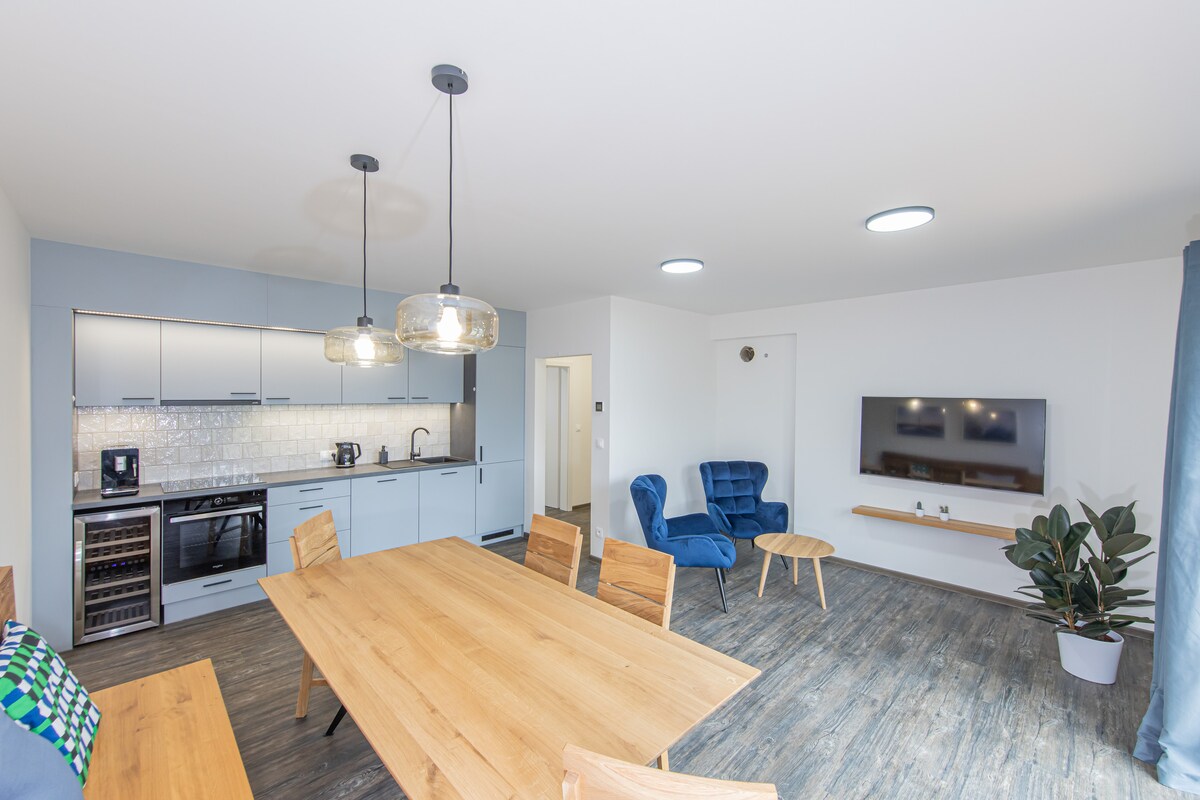 Departamento de lujo en un edificio nuevo con baño y cocina con cafetera. Alojamiento sin contacto, sin llaves. Las sábanas damask en los edredones extendidos, las persianas externas y la recuperación se encargarán de tu descanso. Una terraza privada solo para ti. Aparcamiento seguro gratuito. Sala de bicicletas/esquí disponible. Ubicación ideal para esquiar, montar en bicicleta, hacer senderismo. En las inmediaciones de la zona de spa, una piscina, pero también una amplia gama de actividades para los entusiastas del deporte.