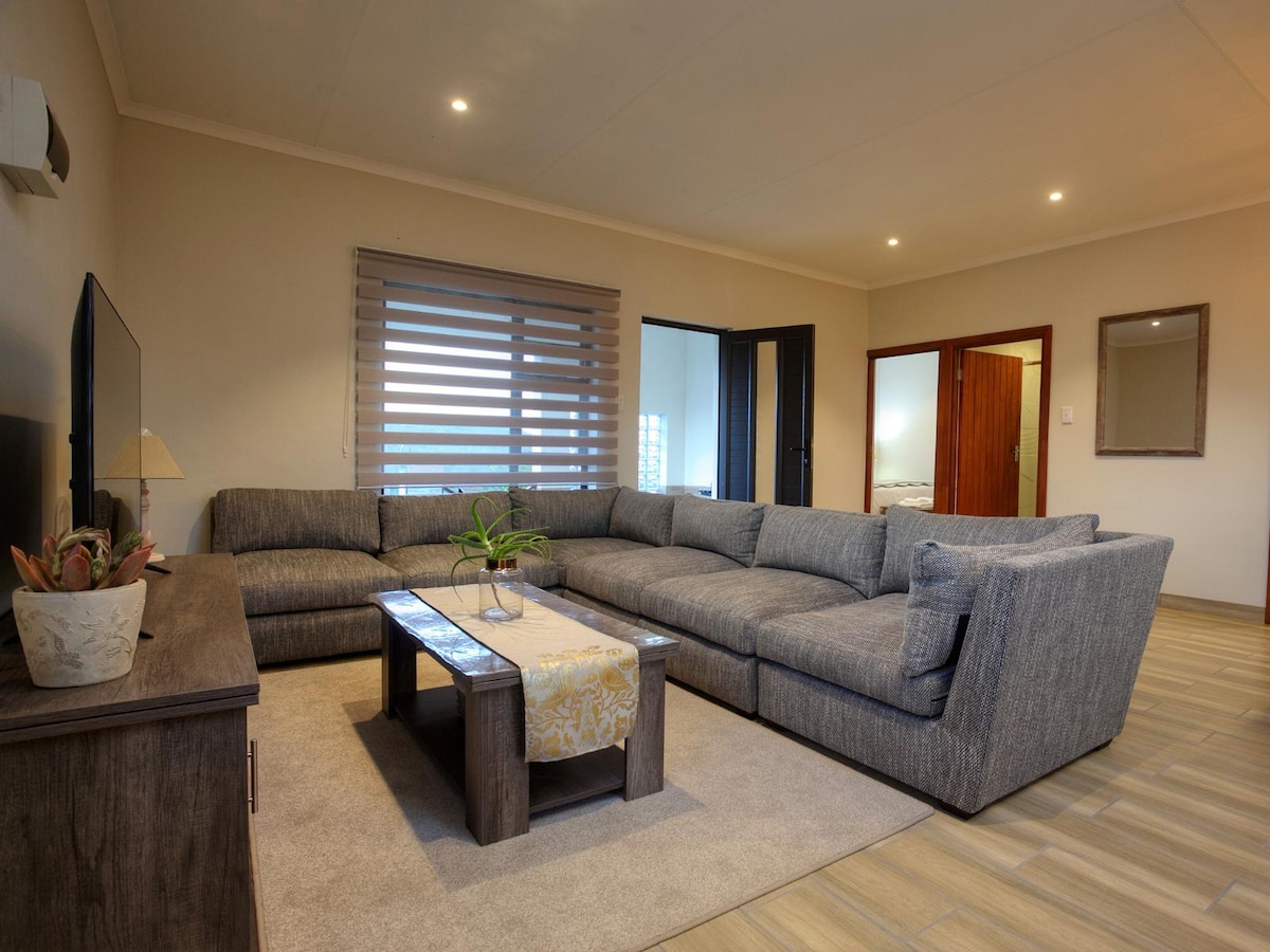Cama tamaño queen, baño completo, sofá cama, salón, mesa de comedor, TV, wifi, servicio diario, cocina americana bien equipada, nevera, microondas, hervidor de agua, tostadora, tés, café, aire acondicionado, calentadores, mantas eléctricas. Jardín privado propio. Braai y piscina.