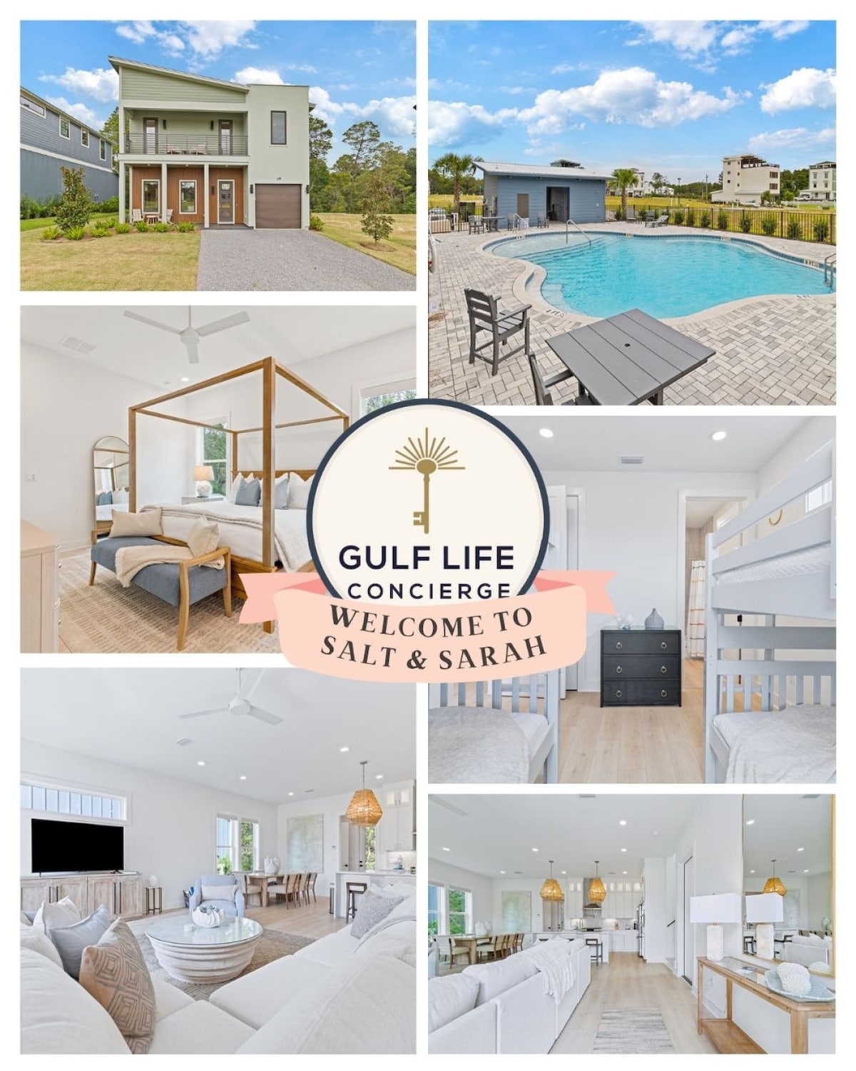 Welcome to Salt and Sarah, a brand-new luxury two-story home located in the serene community of Inlet Beach. Nestled in a quiet neighborhood with access to a sparkling community pool, this home offers the perfect balance of relaxation and convenience. Just 10 minutes walk to the beach, moments from the stylish shops and dining at 30Avenue, and a short drive to the iconic coastal towns along scenic Highway 30A, this retreat places you right at the heart of the Emerald Coast lifestyle.