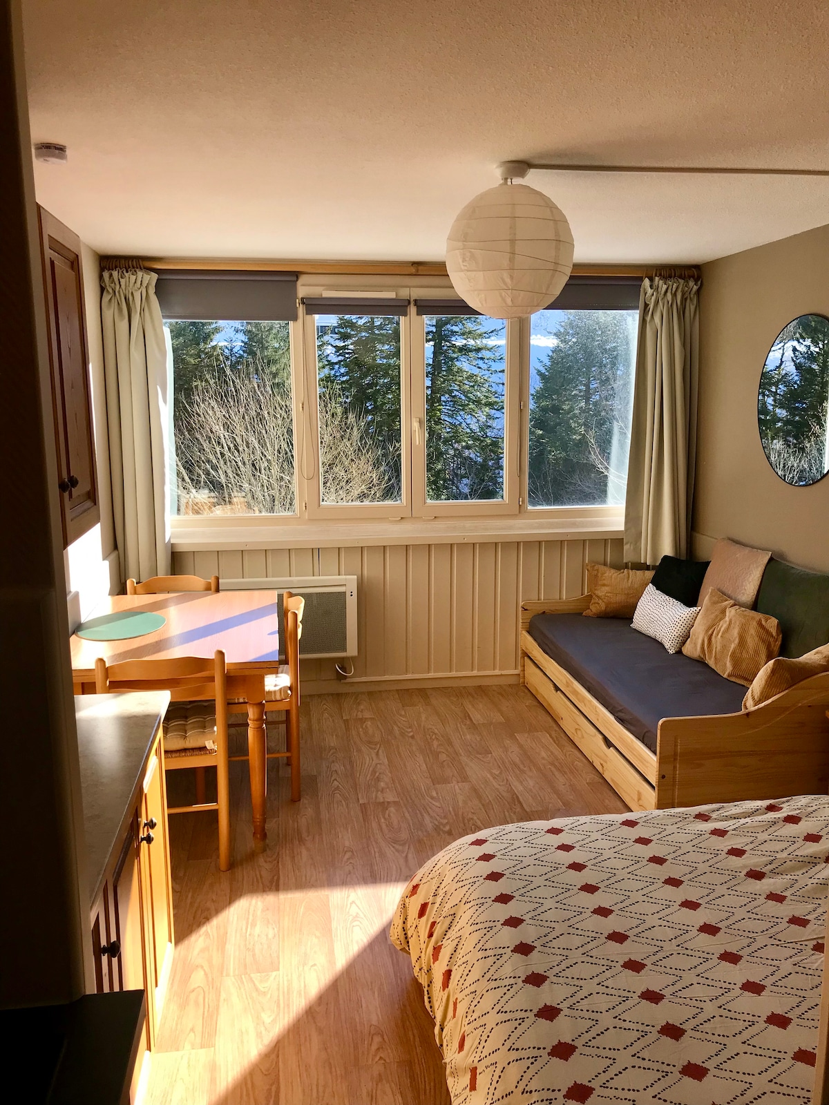 Estudio reformado de 24 m2 en el corazón de la estación (a 50 metros de los telesillas) en residencia con ascensor y guardaesquís. Banco desplegable con 2 colchones de verdad para mayor comodidad y una litera, es decir, 4 camas Cocina equipada con microondas ( que hace de horno), vitrocerámica, tostadora, nespresso, raclette... Cuarto de baño con bañera. No se proporcionan sábanas y toallas (se proporcionan mantas y almohadas) No fumadores No se admiten animales Limpieza a realizar. Posibilidad wifi por 5€ más