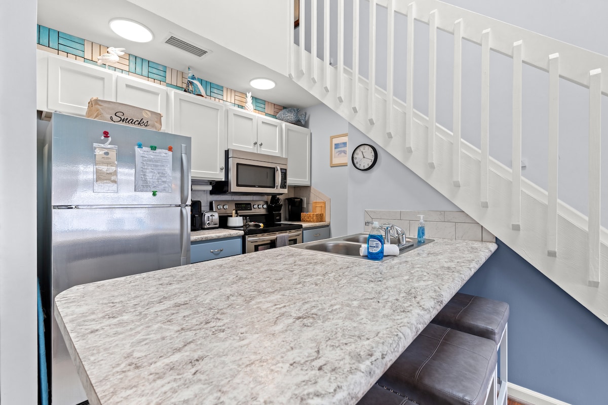 Apartamento de 3 dormitorios recién renovado, a 1 manzana de la playa, granito, lavadora/secadora, televisores inteligentes. Ubicación ideal para la playa, el muelle de Surfside y muy cerca de Myrtle Beach y Murrells Inlet, ¡hay mucho que hacer para toda la familia! Después de un día en la playa, disfruta relajándote en la piscina o en el cenador con vistas al lago. ¡Armario de almacenamiento en la planta baja para guardar todos tus artículos de playa y palos de golf! *Esta es una unidad del tercer piso (sin ascensor).* ** ¡DESCUENTO PARA AVE NEVADORA para los meses de invierno! **
