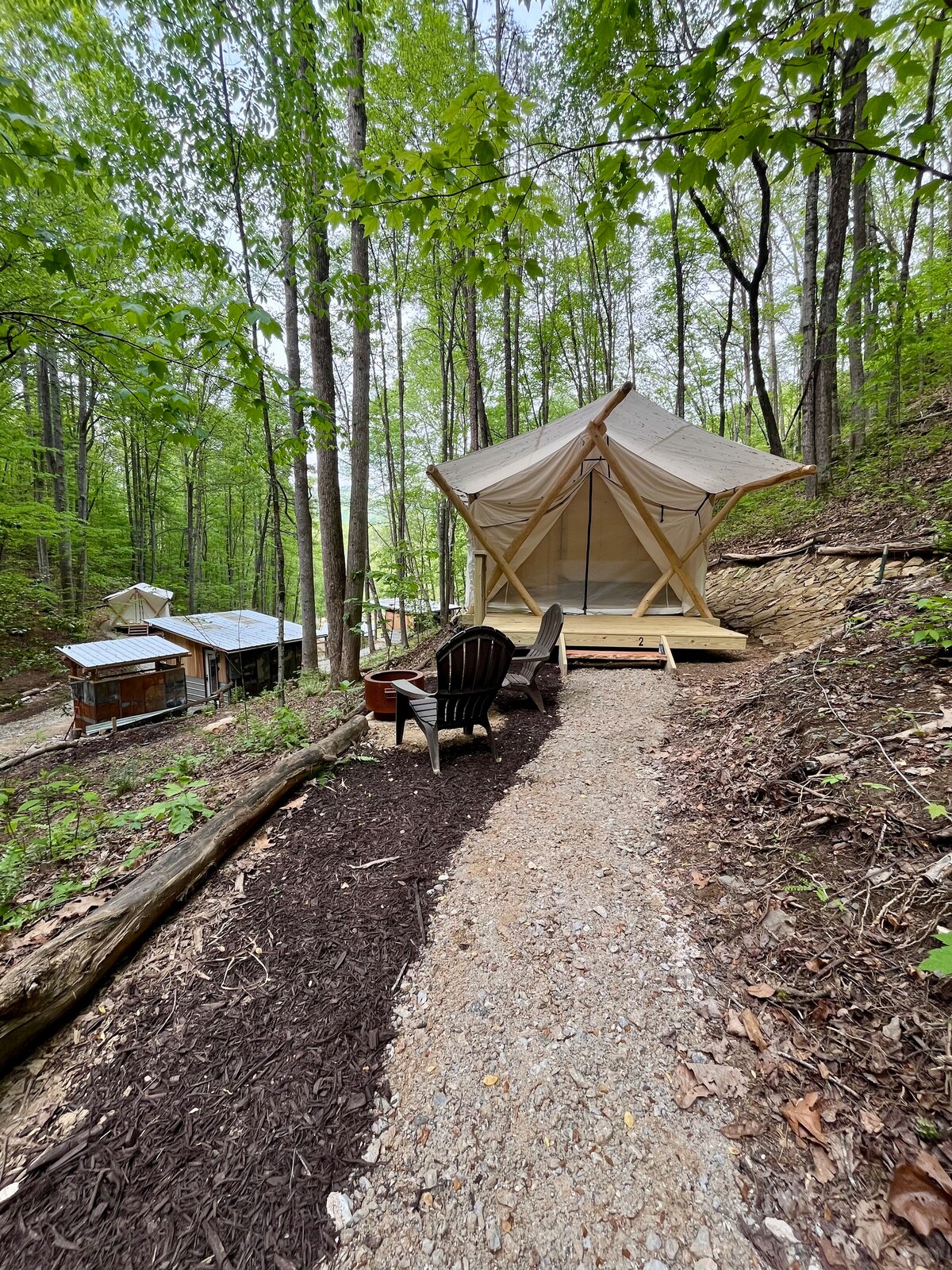 Ven y disfruta de una lujosa tienda de safari africano enclavada en las montañas Great Smoky. Esta tienda de campaña de alta gama cuenta con todas las comodidades y servicios del hogar mientras está rodeada de naturaleza en un tranquilo telón de fondo boscoso. El espacio tiene un concepto de planta abierta con sala de estar estilo estudio, una cama, un baño, una cocina completa y sala de estar, y espacio para estar al aire libre en un entorno sereno. La gran terraza envolvente con una sala de estar cubierta, jacuzzi y amplias vistas elevadas se siente como una casa del árbol.
