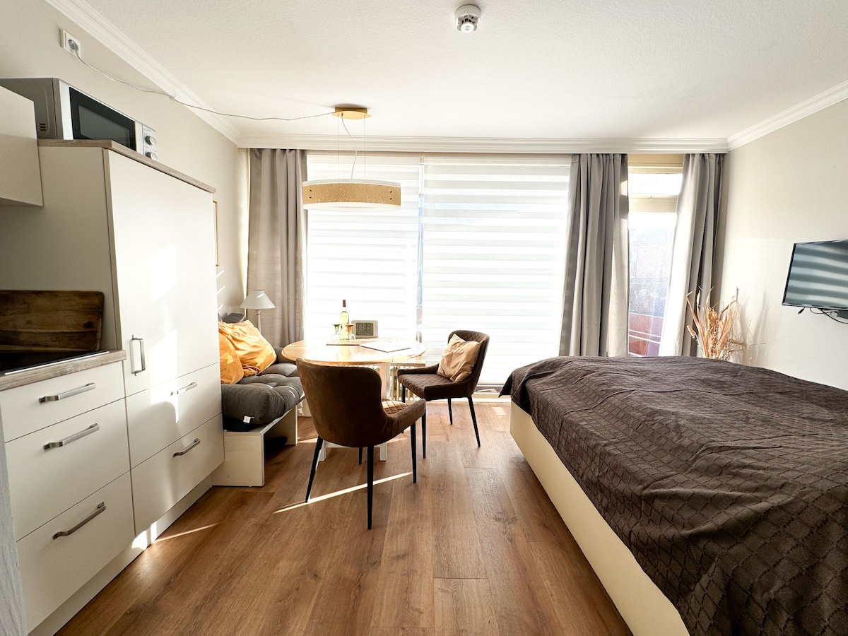 Diese sehr gemütliche 1 Zimmerwohnung für 1-2 Personen (ca. 35 m²) verfügt über einen Wohn-/Schlafraum, eine sep. EBK im Flur, Duschbad sowie einen Balkon zur ruhigen Nordseite. Waschmaschine gegen Gebühr im Haus. Nur 2 Minuten zum Strand. Zur Wohnung gehört ein gratis Tiefgaragenstellplatz.