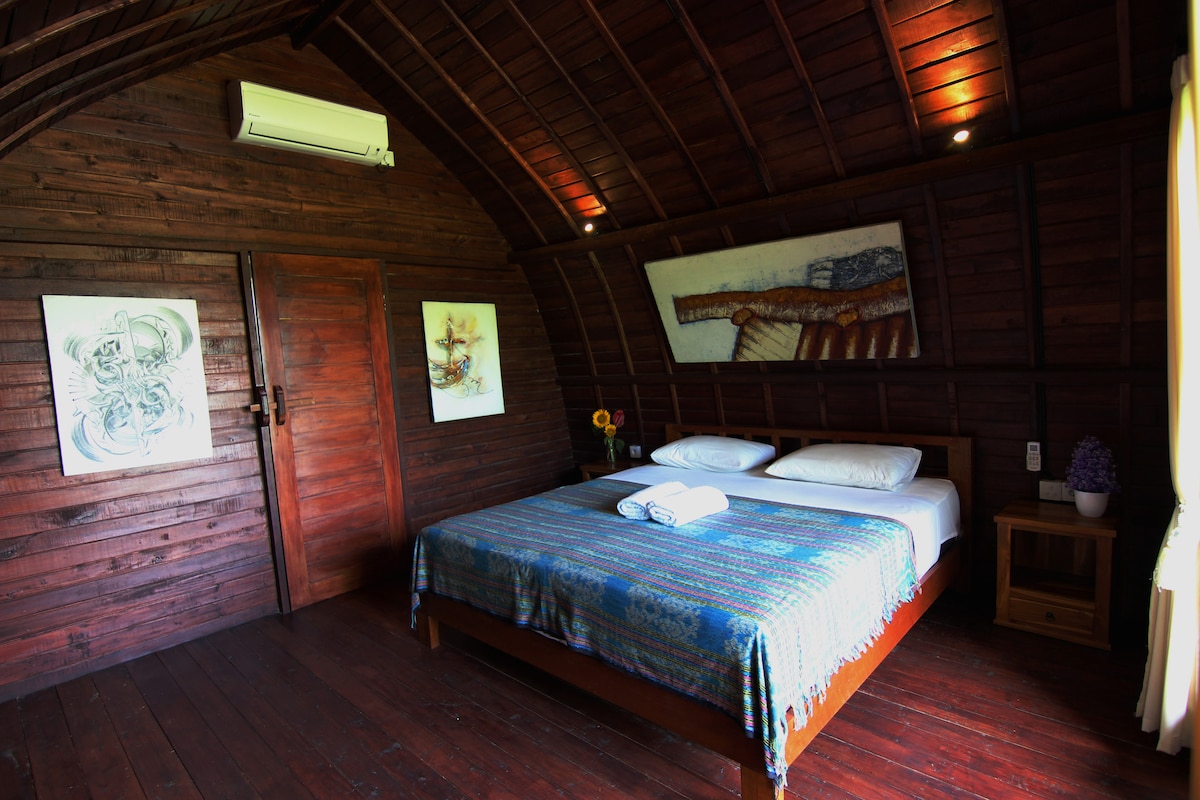 Esta casa de playa de madera de estilo Sumatra es muy sencilla, relajante y tiene todo lo necesario para que tu estancia en la playa en el oeste de Bali sea muy agradable. Es una configuración de estilo estudio con un área de cocina al aire libre, baño de estilo balinés tradicional y ducha fría/caliente al aire libre y cama doble con ventilador de techo y red de mosquitos. Tiene un bonito patio al aire libre para relajarse en los jardines, y está a solo 3 minutos a pie de la playa privada.