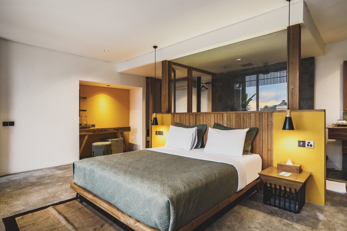 Bienvenido a nuestra nueva habitación suite, inspiradora y suave vibra estética para viajeros creativos. Habitación de 1 cama inspirada en el diseño mediterráneo crudo, en el lugar animado y tranquilo en la moderna zona de Canggu. La propiedad ofrece una experiencia encantadora de vida de lujo. La propiedad está a pocos minutos del restaurante de lujo más nuevo de la zona, a solo 5 minutos en coche, o disfruta del tranquilo ambiente de playa a solo 7 minutos de tu puerta.