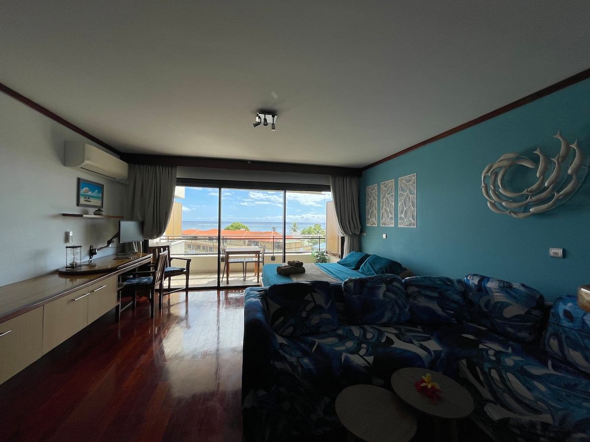 El estudio Blue Moana con vistas al mar en una residencia de lujo con aparcamiento privado, terraza, piscina, gimnasio, situado en el centro de Papeete a 5 minutos del muelle de ferry en coche, salidas cada 50 minutos para visitar la isla de Moorea Con una ubicación ideal para pasar una agradable estancia en Tahití. ¡Está situado a 11 km de la punta Venus (playas de arena negra), a 15 km del lugar de surf Papenoo, excursiones a pie o en 4x4 con sus hermosos ríos y cascadas a 18 km de las hermosas playas de arena blanca!