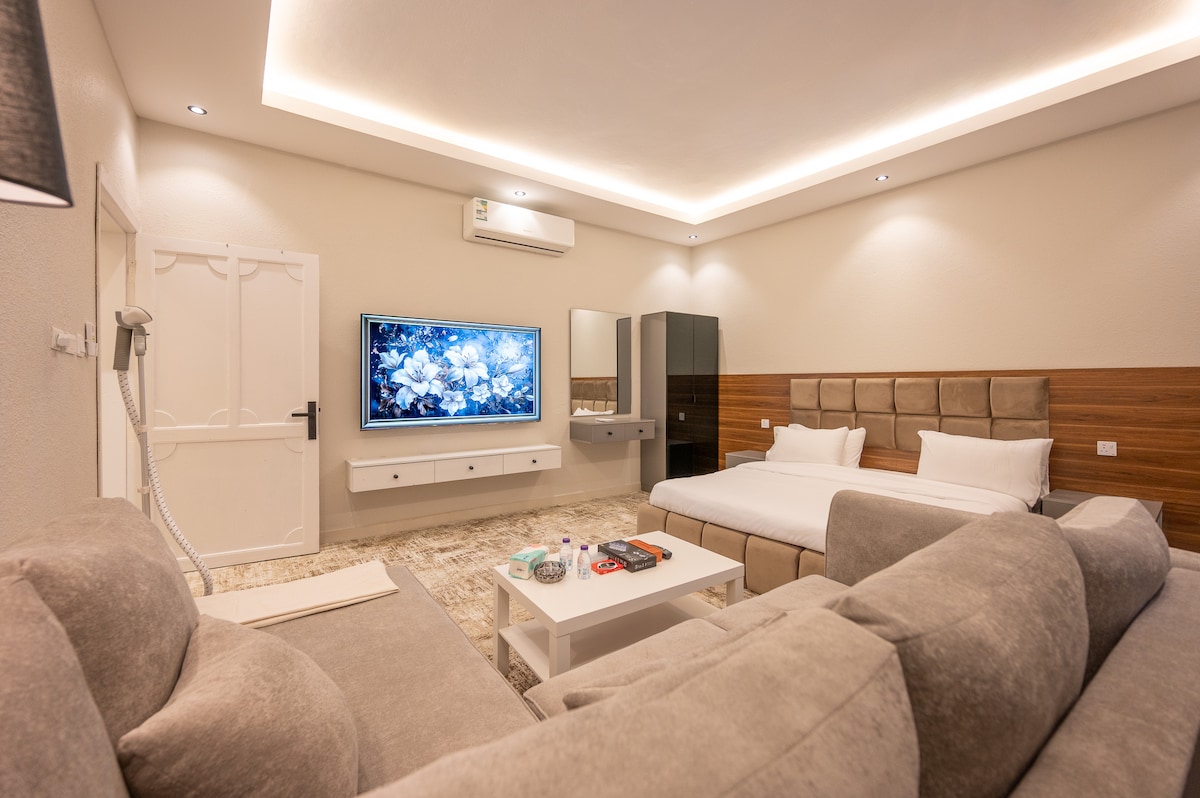 Relájate en este alojamiento tranquilo y elegante. Suite de lujo con vistas panorámicas completas al jardín, con moreras, rosas, rosas y vides, servicio de entrada inteligente, además de una gran pantalla moderna con tecnología UHD 4K con suscripción al servicio iptv, todos los canales del mundo, además de los canales deportivos Bein, Saudi Sports, showtime, Netflix y todas las películas y series. ((y la Copa del Mundo😍)) Hay una mezquita cerca de la vivienda. Cerca del parque Al-Radf, restaurantes, mercados y cafés de lujo. Hay un guía turístico para proporcionar a los huéspedes todos los lugares que vale la pena visitar.