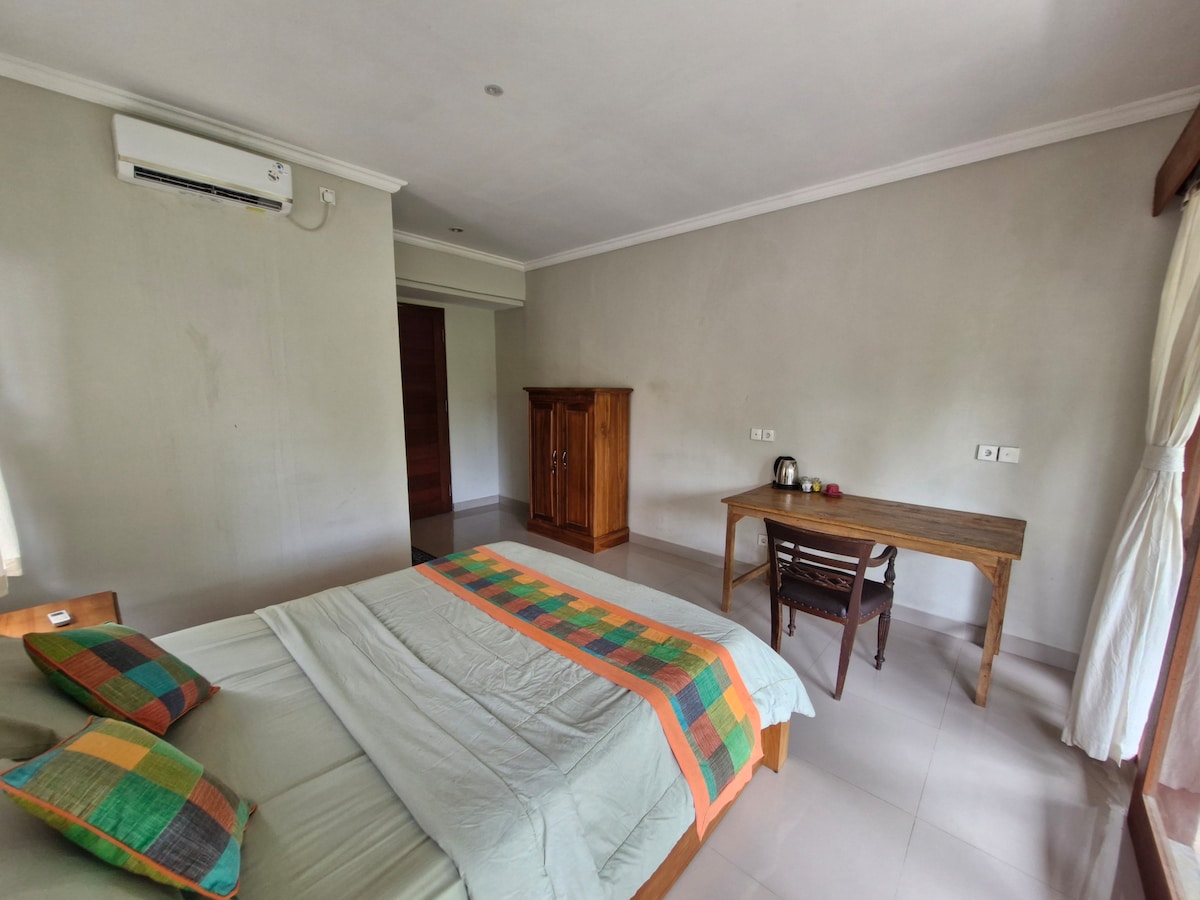Por qué te va a encantar: 1. Callejón tranquilo, a pocos minutos del centro de Ubud 2. Balcón privado con vistas a la naturaleza 3. Desayuno gratuito entregado a diario 4. Aire acondicionado y una cama cómoda 5. Wifi rápido + mesa y silla, para trabajar a distancia 6. Baño privado con ducha de agua fría/caliente 7. Aparcamiento gratuito para escúteres + fácil acceso a Grab/Gojek Ideal para parejas, viajeros solitarios o nómadas digitales.
