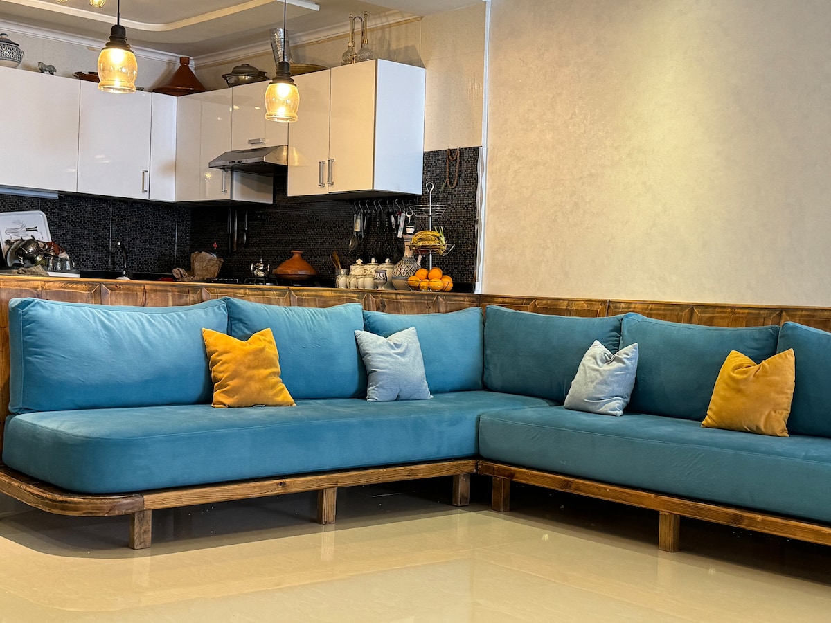 Bienvenido a nuestro encantador apartamento de 3 dormitorios ubicado en el vibrante corazón del hipercentro de Tánger. Todas las comodidades necesarias están disponibles: aire acondicionado, Smart TV, Netflix, conexión a Internet de fibra óptica, cafetera, toallas, artículos de aseo, etc. Ubicado en el último piso del edificio con acceso a ascensor, estás a solo unos escalones de acceder a la increíble azotea y admirar las impresionantes vistas de Tánger, España, el estrecho de Gibraltar y las montañas de Chefchaouen.