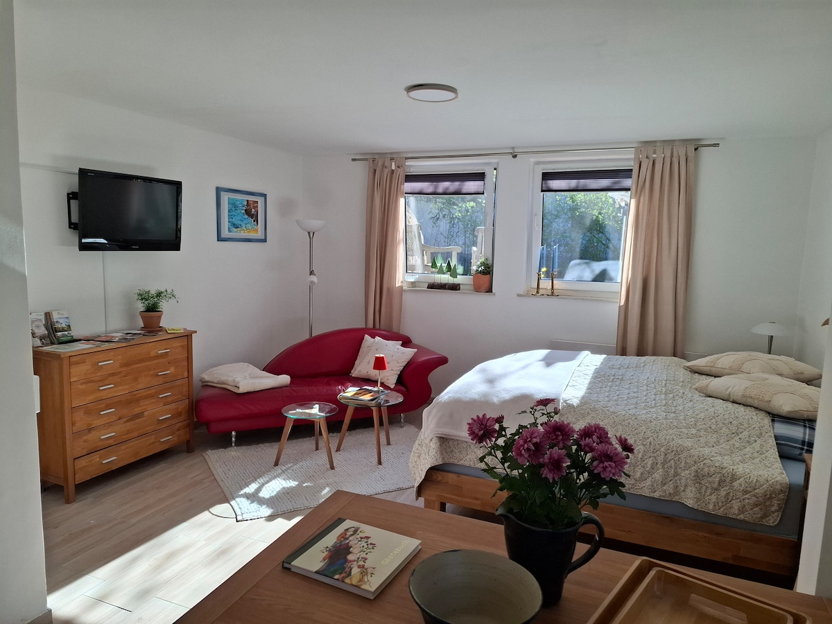 Unsere gemütliche Maisonette-Wohnung auf 38 m² bietet mediterranen Charme auf zwei Etagen – mit eigener Terrasse und separatem Eingang. Der helle Wohn- und Essbereich im Erdgeschoss lädt zum Verweilen ein, während das romantische Schlafzimmer im Dachgeschoss mit niedriger Decke ein besonderes Ambiente schafft. Alternativ ist auch Schlafen im Erdgeschoss möglich. Ein kleines Bad mit Badewanne rundet das Angebot ab. Perfekt für Paare oder Alleinreisende, die Ruhe und Natur suchen.