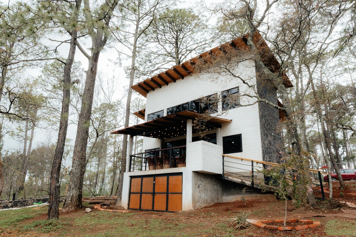 Disfruta de la naturaleza en familia o amigos en nuestra cabaña ecologica, ubicada en el fraccionamiento Pinares Tapalpa - Mas de 1,500m2 de área totalmente cercada. - Capacidad para recibir de 6 a 8 personas (niños incluidos) - Terraza con asador estilo argentino, mesa con 8 equipales y hielera. - Cocina equipada con refrigerador, parrilla, horno, platos, vasos y utensilios de cocina - Sala con chimenea - 2 habitaciones, cada una con 2 camas queen size. - 2 baños completos. - Wifi disponible