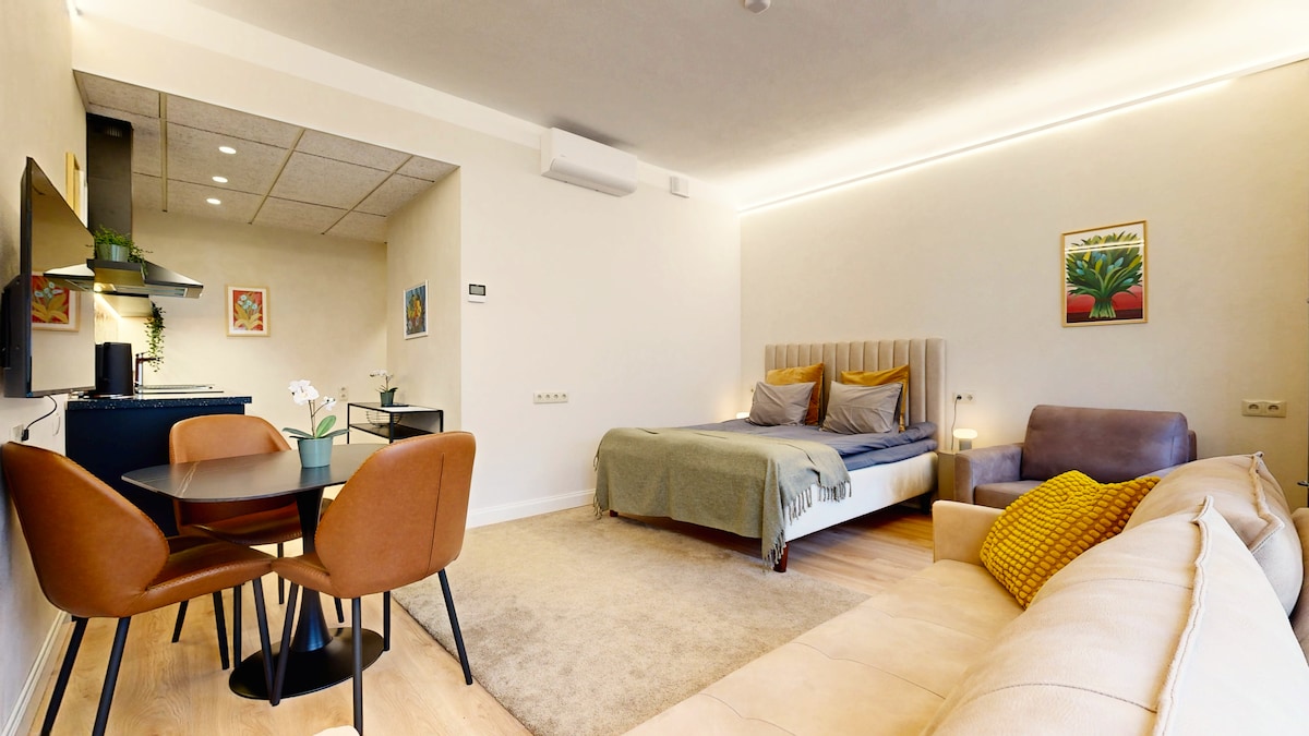 This two-level loft is a true heart-catcher! Its unique concept will leave you in awe and well taken care of. As a breakfast enthusiast, you can treat yourself to your favorite pastries from the first-floor bakery. ☕ And for fitness fans, the building also offers a convenient 24/7 gym. Your apartment's location is one of the best in Tartu: Botanical Gardens, Toome hill & riverside walks are 1 min away. Rüütli street & car-free avenue nearby offerslive performances, street food & nightlife!