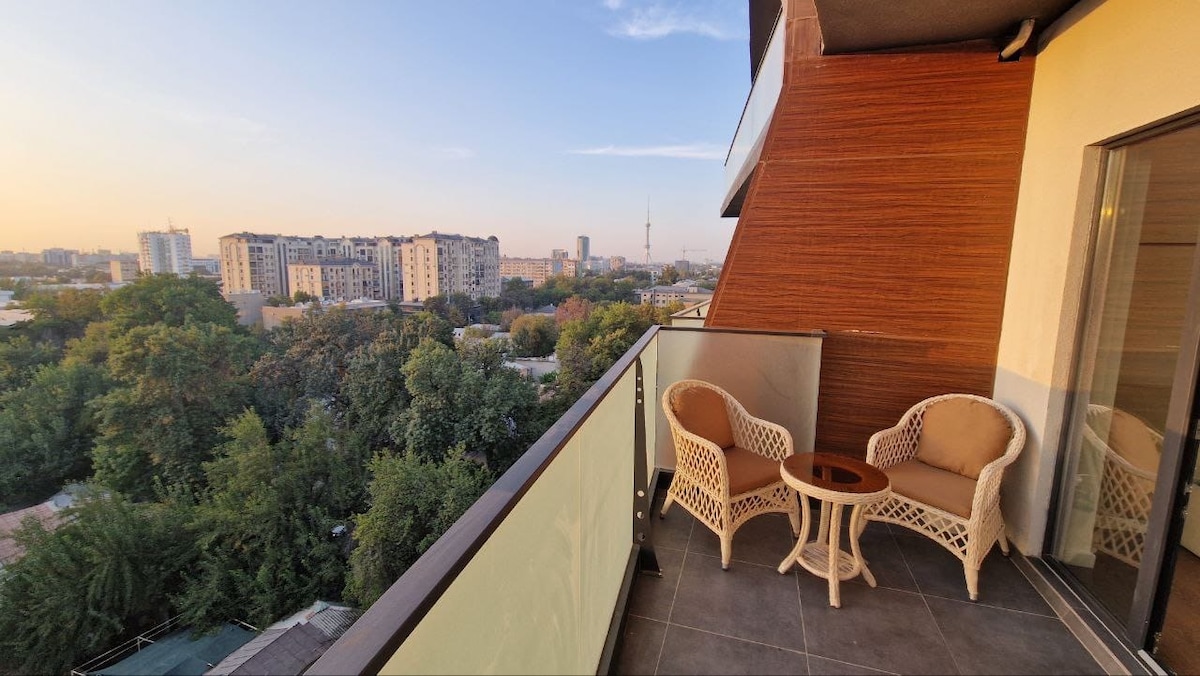 Bienvenido a su elegante escapada urbana: un apartamento nuevo y bellamente diseñado situado en el centro de la ciudad, a solo unos pasos de las principales atracciones de Taskent. 🍳 Cocina totalmente equipada • Electrodomésticos modernos: horno, cocina, nevera, hervidor y utensilios de cocina esenciales. 🛏️ Dormitorios • 2 habitaciones con ropa de cama premium. Dormitorio principal con maquillaje - estación de escritorio • Habitación doble con vestidor • Se proporcionan toallas y artículos de aseo. 🌅 Balcón con vistas a la ciudad con vistas al horizonte y la vegetación de Taskent.