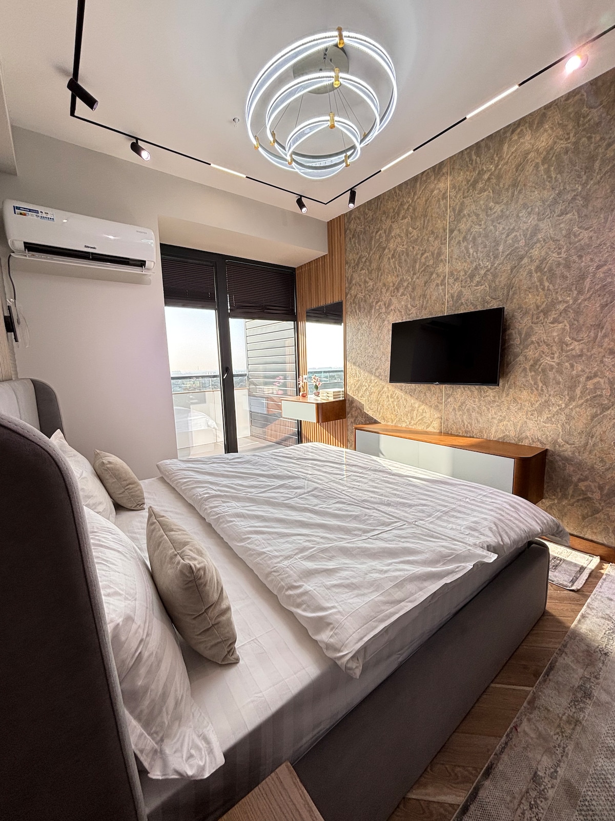 Квартира расположена в центре города в премиальном жилом комплексе «Mirabad Avenue». Район очень динамичен и предлагает множество услуг, включая магазины, супермаркеты и рынки, пиццерии и рестораны, многие из которых являются одними из лучших в городе. Комфортная студия с гостиной с 65-дюймовым Smart TV, спальней и полностью оборудованной кухней. Стильная и современная ванная комната с просторным душем. Есть балкон с прекрасным видом на город.