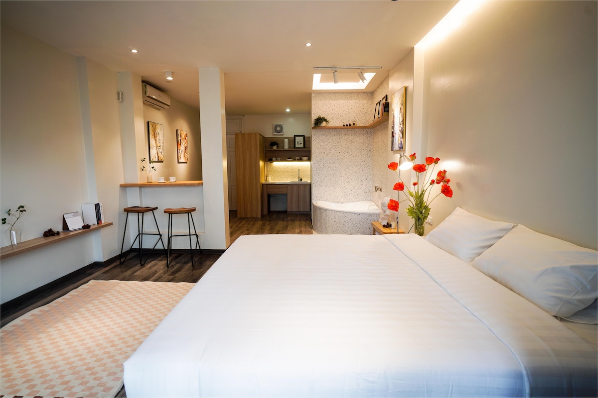Despiértate en un acogedor estudio loft de 30 m2 que equilibra el bullicio del casco antiguo de Hanoi con la calma de un rincón tranquilo. Por qué te va a encantar: Paraíso gastronómico: a pasos del mercado de Châu Long y del mejor Phở Cuốn de la ciudad. La ubicación: un paseo panorámico de 3 minutos hasta el lago Truc Bach y 10 minutos hasta el casco antiguo. Vibra auténtica: experimenta la “verdadera” Hanoi en una calle famosa por sus escuelas de cocina y cafés escondidos. Tranquilo: noches tranquilas en un callejón local.