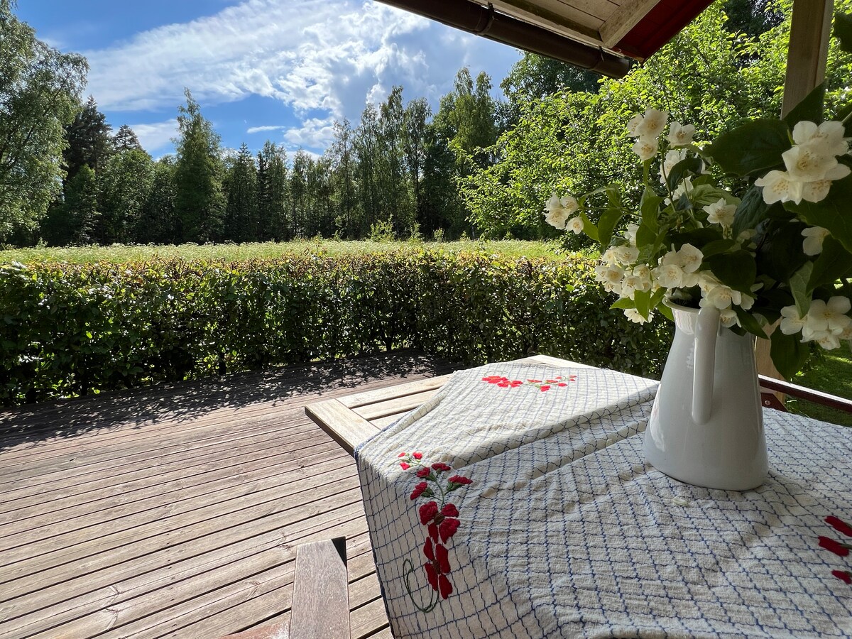 Detta unika ställe är placerat intill skogens rand men ändå närhet till affärer och god kommunikation, inrett med varsamhet och eftertanke. Njut i den varma bastun med utsikt ut över skogen, svalka av dig ute på den stora verandan omsluten av skogens lugn och tystnad. Vem vet det kanske kikar fram något rådjur eller annat vilt djur mellan trädens stammar. Somna sedan gott omsluten av en lugn och behaglig atmosfär, vakna pigg, utvilad och nyfiken inför den nya dagens upptäckter