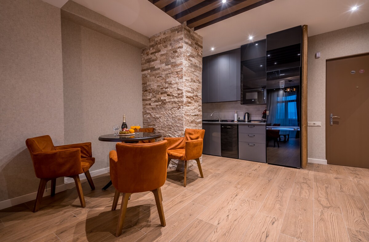 Se trata de un cómodo apartamento renovado con ladrillo visto y auténtico toque típico de Tiflis. El espacio tiene capacidad para 2 personas y se encuentra en una calle histórica de Máximo Gorki. Internet wifi de alta velocidad, una excelente ubicación para viajeros de negocios y turistas. 🛎 Sistema de llegada autónoma. Soluciones de limpieza🧹 profesional después de cada reserva. Se puede organizar el✈️ traslado desde/hacia el aeropuerto.