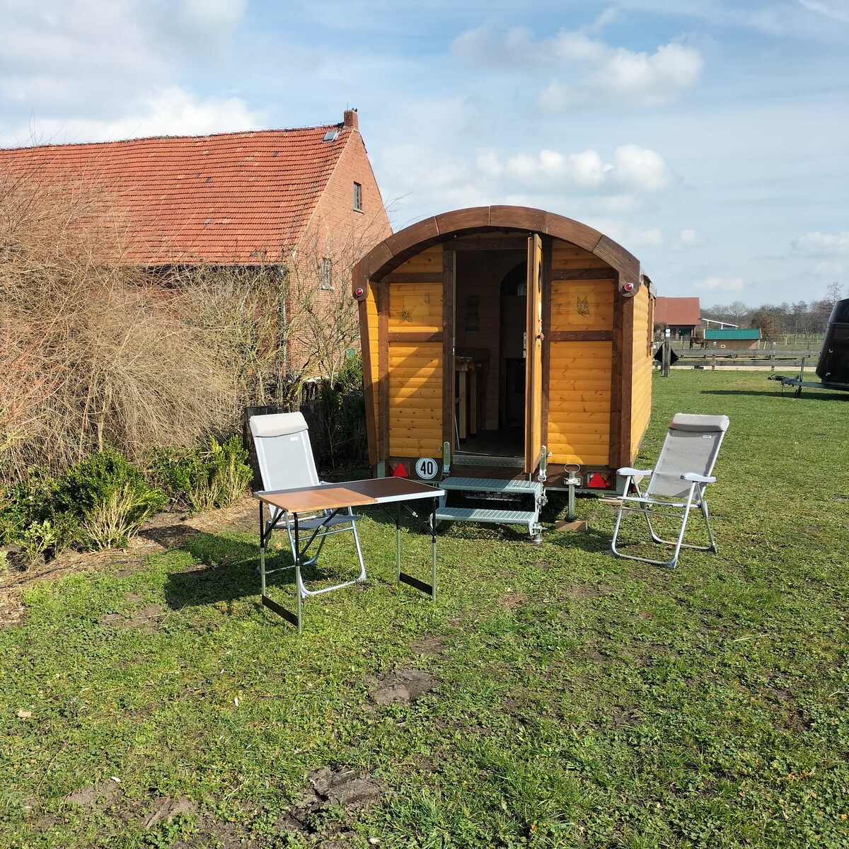 Unser Tiny House steht in einer Streuobstwiese in der Nähe des alten Bauernhauses und vermittelt Ihnen ein außergewöhnliches Wohngefühl. Der Bauernhof liegt im Herzen des Münsterlandes am Rande der Emsstadt Greven. Eingebettet in die Idylle der Aldruper Heide finden Sie bei uns Ruhe & Muße, um die Seele baumeln zu lassen. Durch ein gut ausgebautes Radwegenetz können Sie Münster (15km) und Umgebung leicht erkunden.
