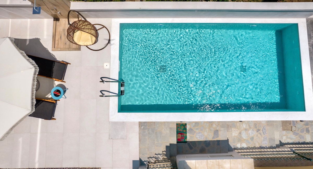 Relájate con una escapada única y tranquila. A solo 1,5 km de Keramoti y del mar, un soplo de absoluta tranquilidad y serenidad con piscina privada, aparcamiento privado, gimnasio, desayuno, platos fríos, jardín en la azotea, barbacoa y carga de vehículos eléctricos. 500 m. Mercado Farmacia a 500 m 600 m Taverna 300 m. Horno