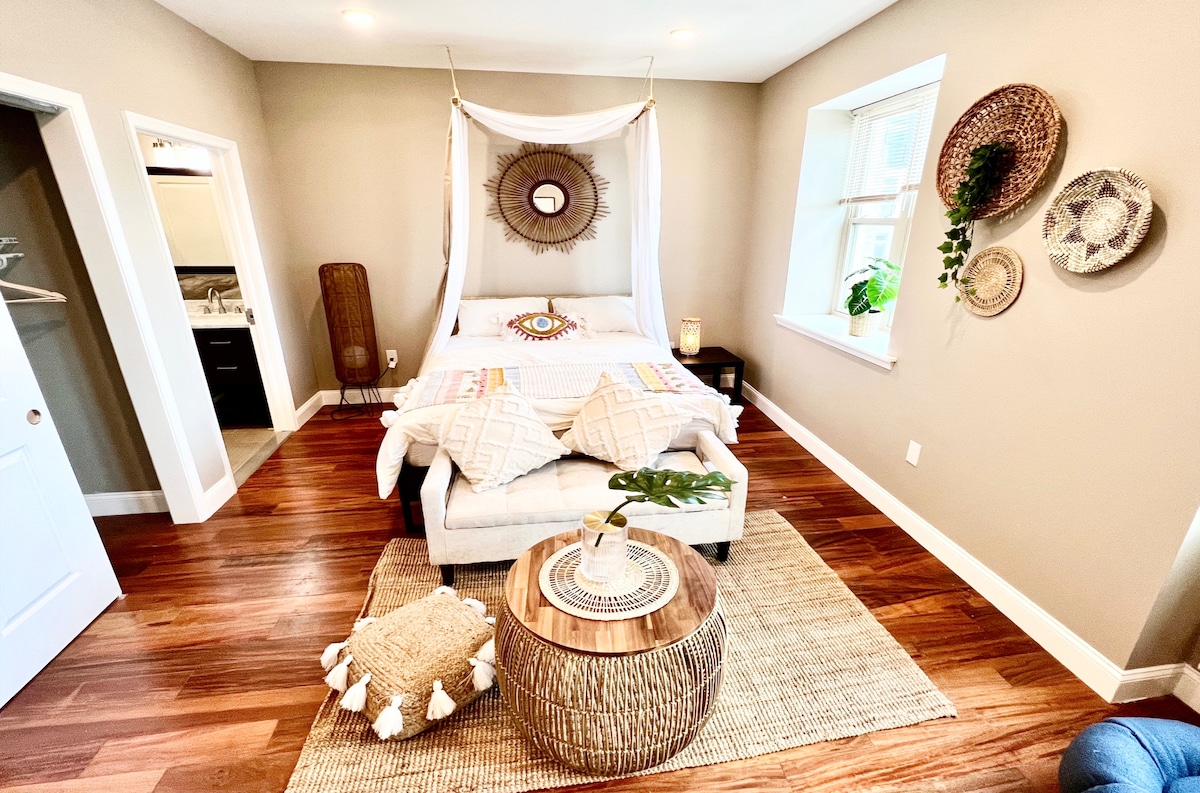 Suite moderna con chimenea, patio trasero, lavandería gratuita