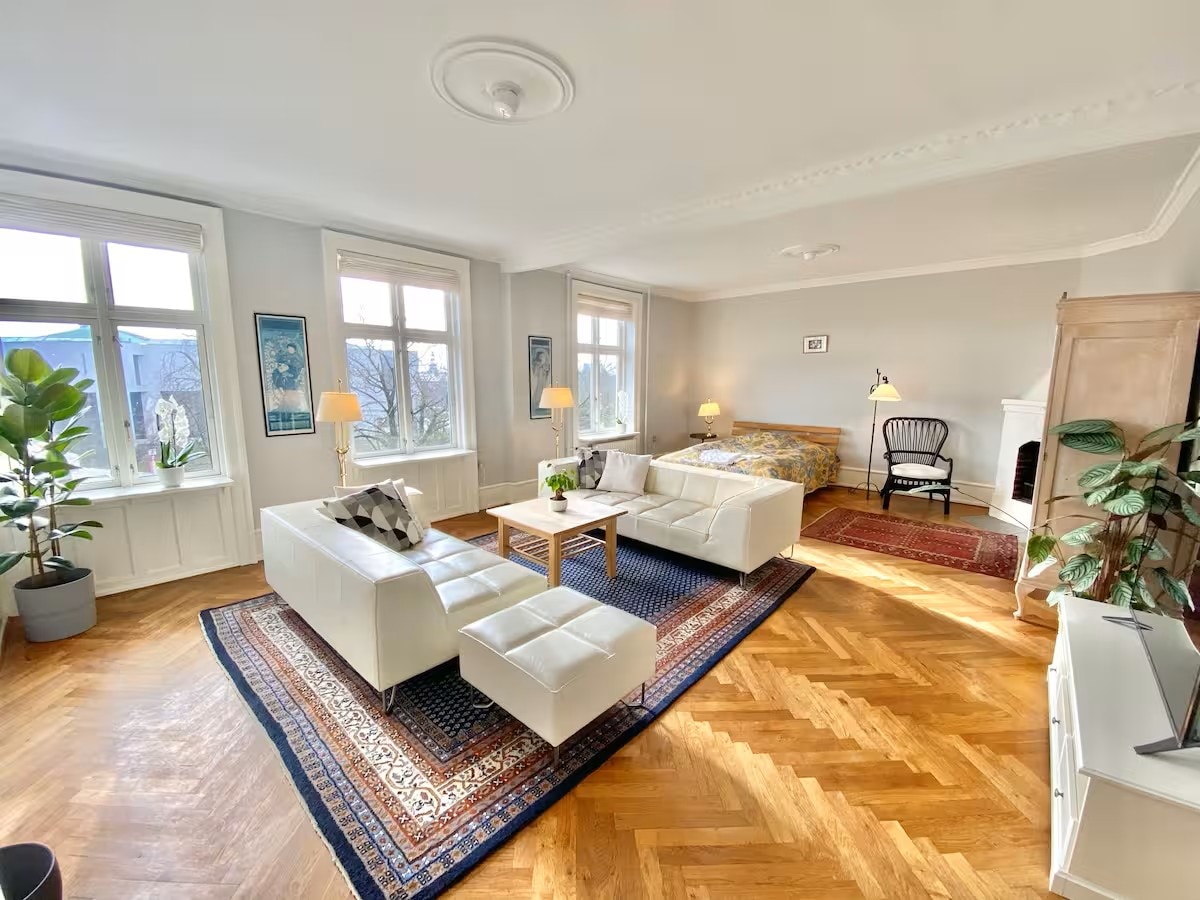 This 120m² apartment is located in Stockholmsgade - one of the most attractive streets in the heart of Copenhagen. It has a front view to the park Øster Anlæg and the National Gallery of Denmark. It is an exceptionally quiet stree, but in less than 3 minutes walk there is a lively street with shops, cafés, bars, restaurants and supermarkets. Copenhagen’s main pedestrian shopping street is only 10-15 minutes away on foot.